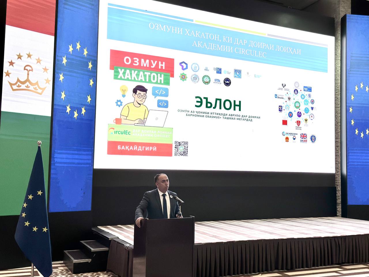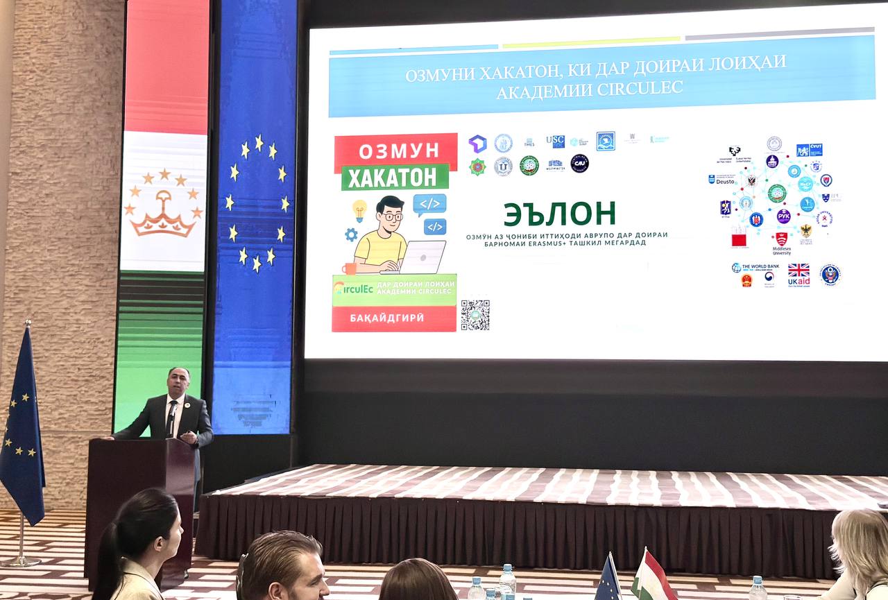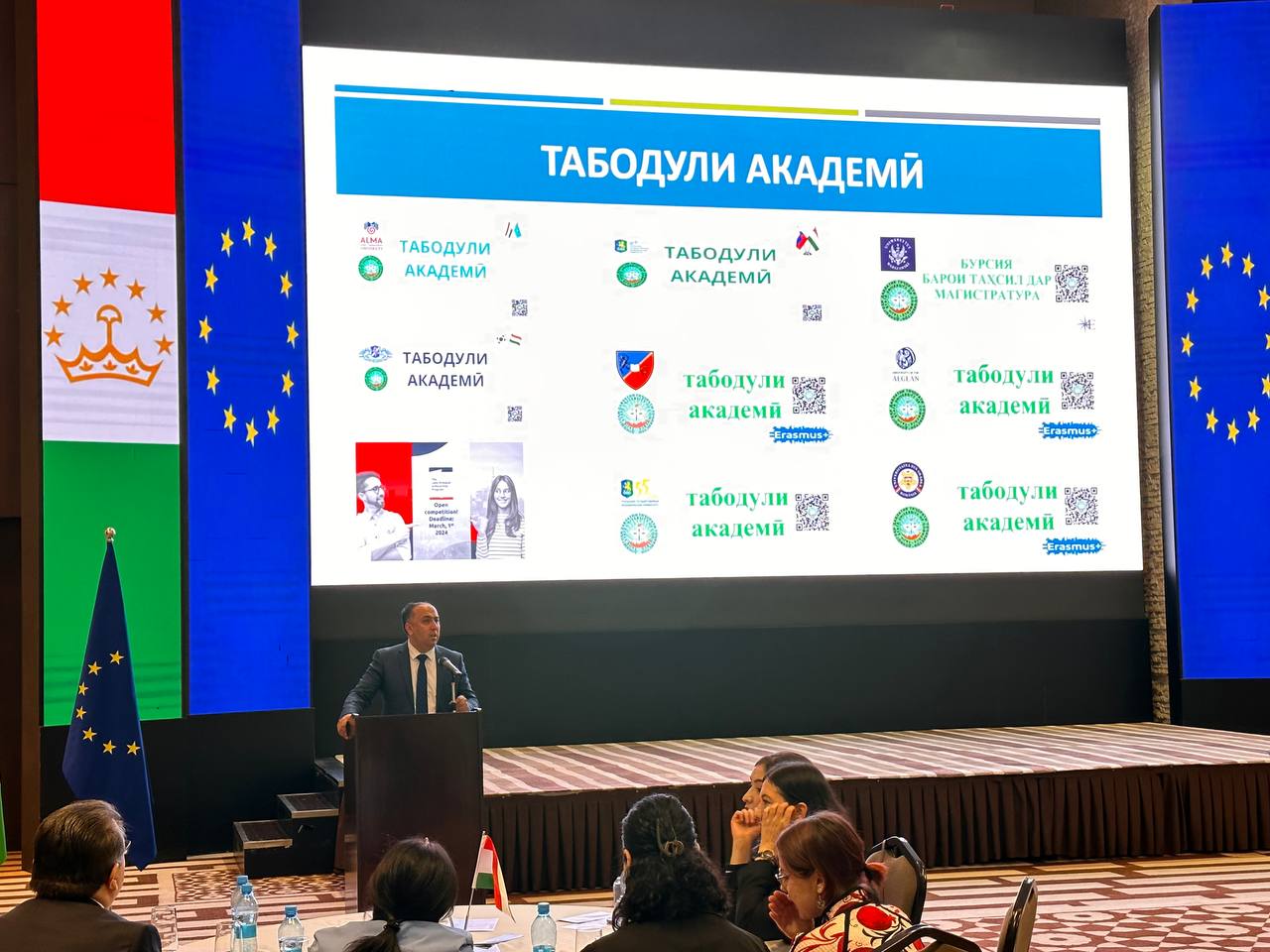 Аз номи ДДТТ муовини ректор оид ба илм ва робитаҳои байналмилалӣ Ҷамшед Машокиров дар мавзуи «Иқдомҳои амалкунандаи барномаи Erasmus +: таваҷҷуҳ ба раванди байналмилалии табодули академӣ ва фаъолияти Jean Monnet» маърӯза намуд. Зимни суханронӣ ӯ аз дастовардҳои донишгоҳ дар самти татбиқи лоиҳаҳои барномаи Erasmus+, аз ҷумла натиҷаҳои лоиҳаҳои ҷории CBHE – E4TLI (Technology Literacy and Inclusion), CIRCULEC (Development of Innovative Curricula and Modules in Circular Economy and Sustainable Development) ва дигар лоиҳаҳои амалкунанда ёдовар шуд.