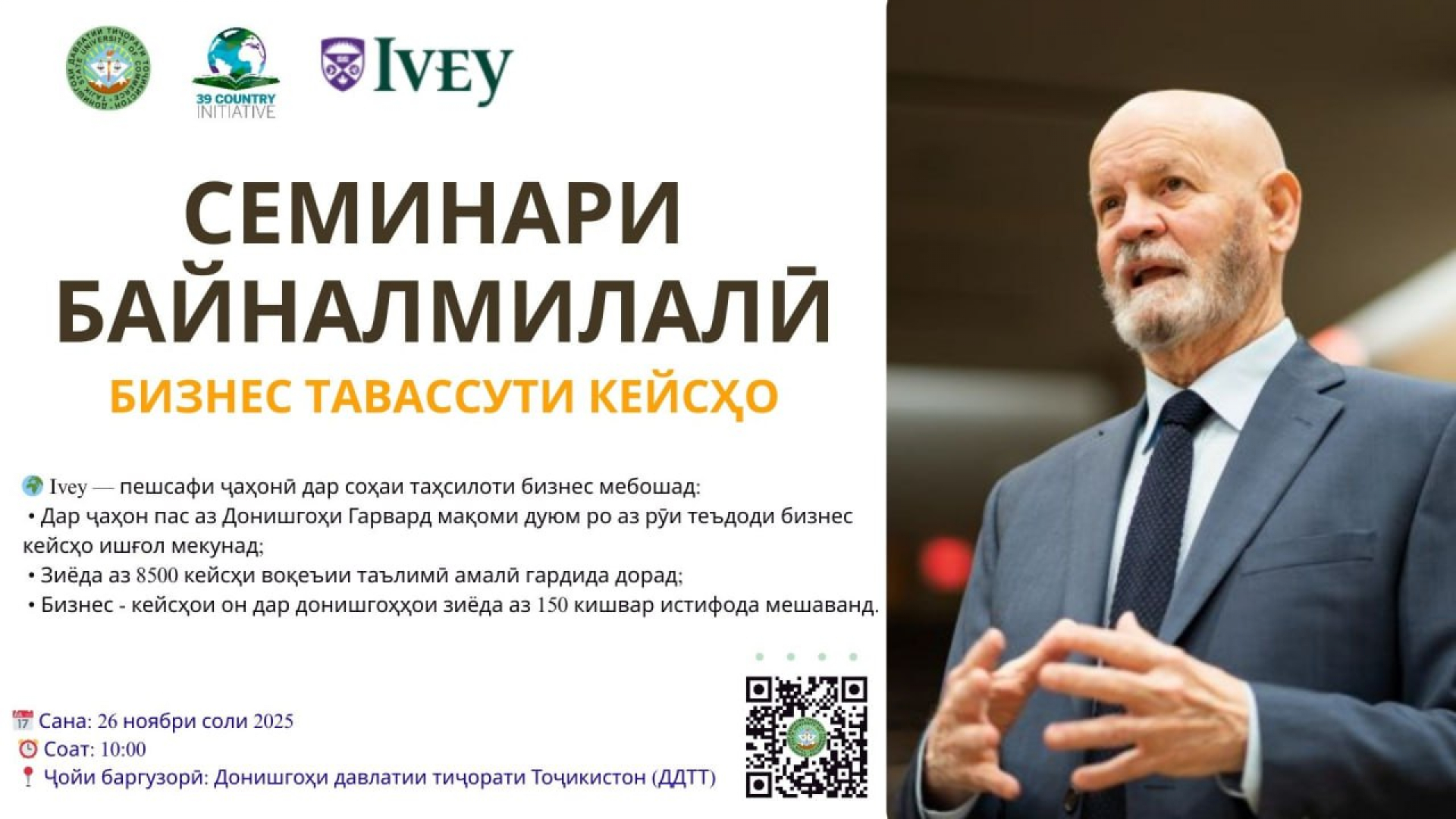 Донишгоҳи давлатии тиҷорати Тоҷикистон бо хушнудӣ иттилоъ медиҳад, ки бори аввал дар Тоҷикистон инчунин дар ДДТТ семинари 39-юми “Country Initiative” дар ҳамкорӣ бо Мактаби тиҷоратии Айви, Донишгоҳи Ғарбии Канада баргузор мегардад.