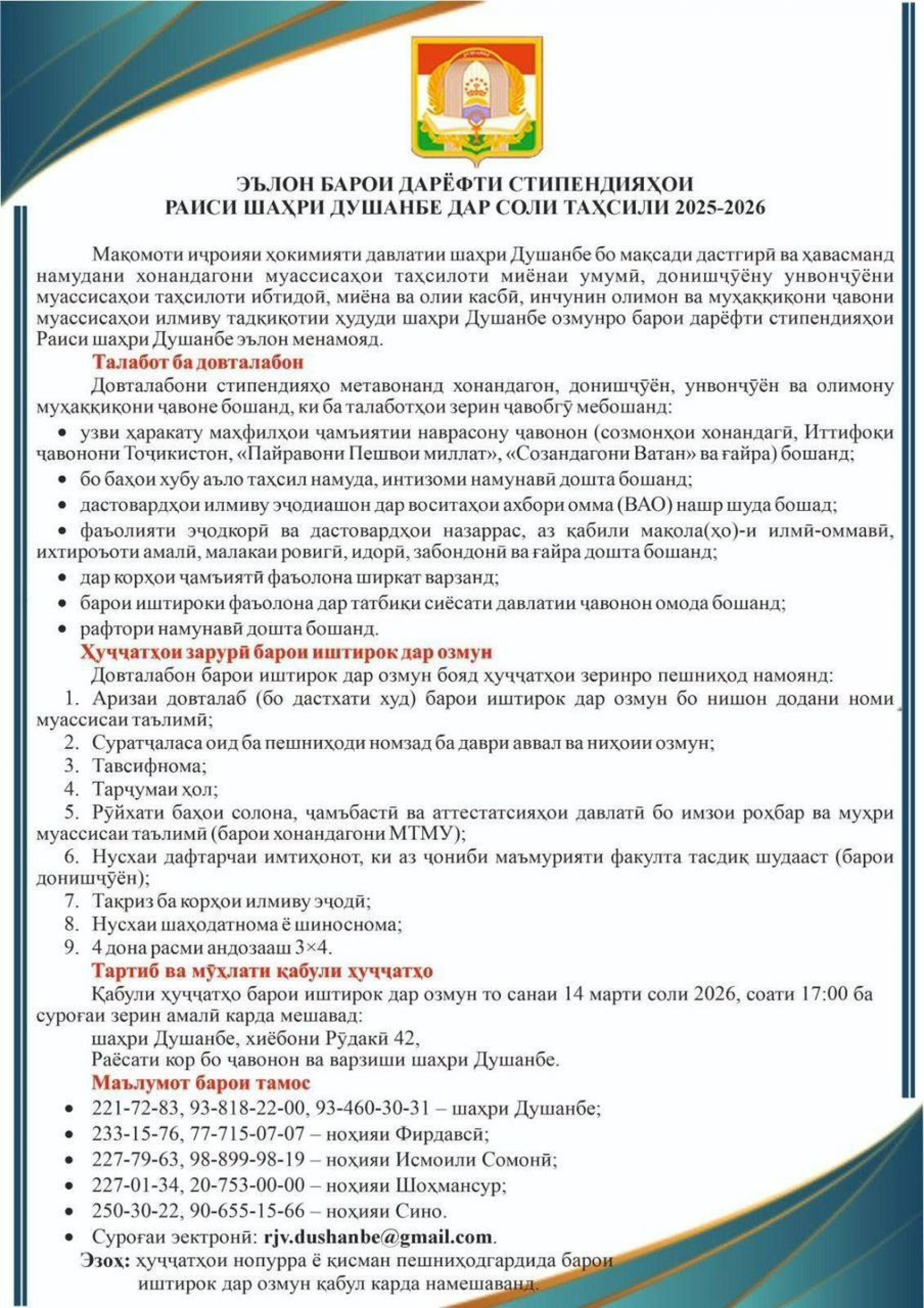 ЭЪЛОН БАРОИ ДАРЁФТИ СТИПЕНДИЯҲОИ РАИСИ ШАҲРИ ДУШАНБЕ ДАР СОЛИ ТАҲСИЛИ 2025-2026