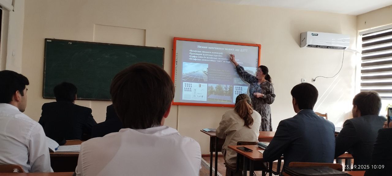 Санаи 23-юми сентябри соли 2025 дар факултети молия ва қарзи Донишгоҳи давлатии тиҷорати Тоҷикистон дотсенти кафедраи менеҷмент, маркетинг ва иқтисодиёти меҳнат Ҳисориева Гулнора Тоировна аз фанни “Асосҳои менеҷмент” дар мавзӯи “Идоракунии муҳити зист” бо донишҷӯёни курси 3-юми ихтисоси 260202-менеҷмент дарси кушод баргузор намуд.
