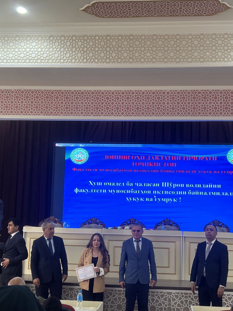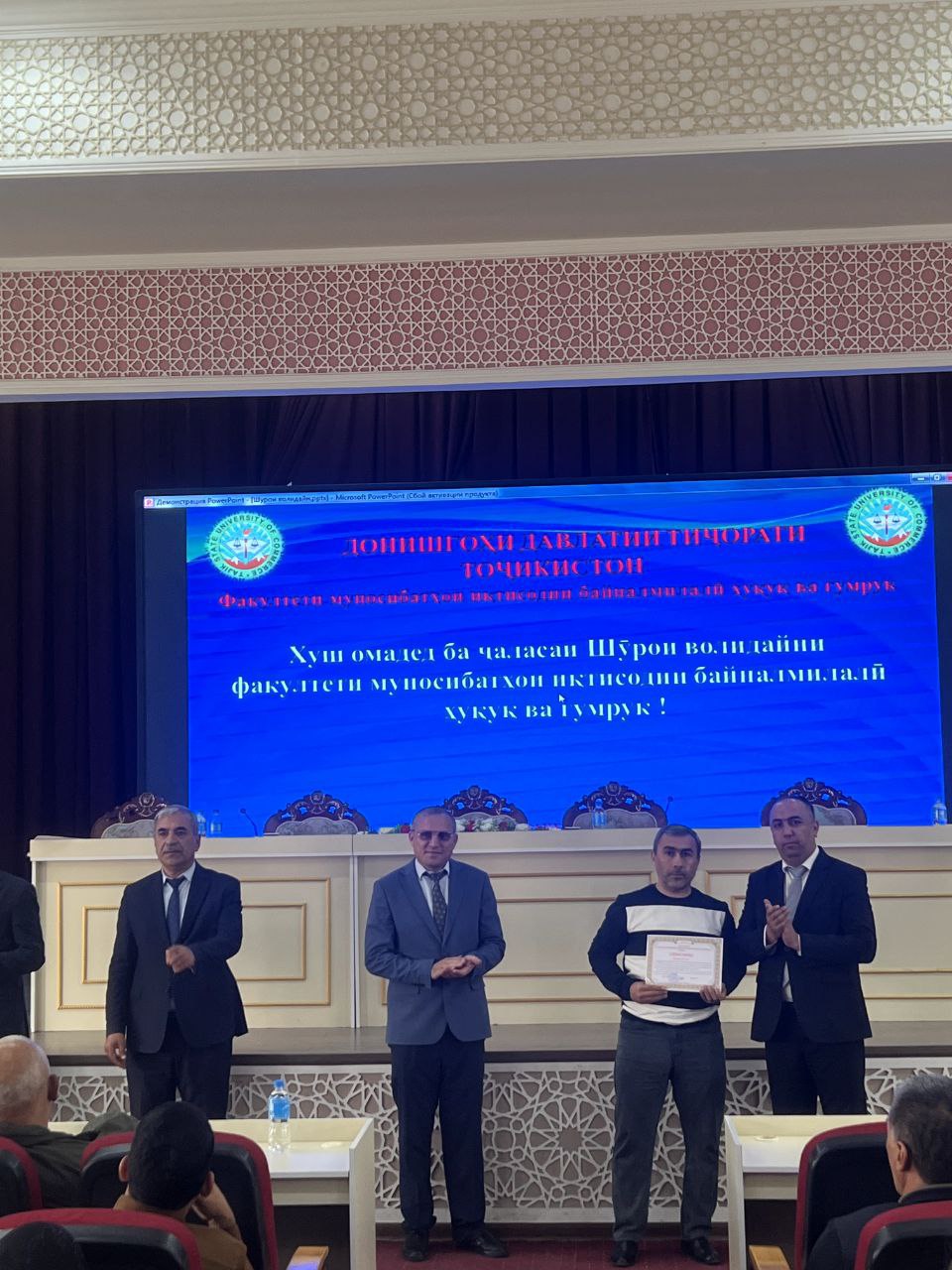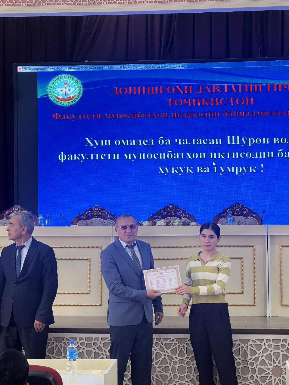 Дар фарҷоми ҷаласа чанде аз донишҷӯёне, ки тариқи имтиҳонҳои Маркази миллии тестии назди Президенти Ҷумҳурии Тоҷикистон ба донишгоҳ дохил шуданд ва дар чорабиниҳои таълимӣ, илмӣ, тарбиявӣ ва ҷамъиятии донишгоҳ фаъолона иштирок менамоянд, бо сипосномаҳои раёсати донишгоҳ қадрдонӣ карда шуданд.
