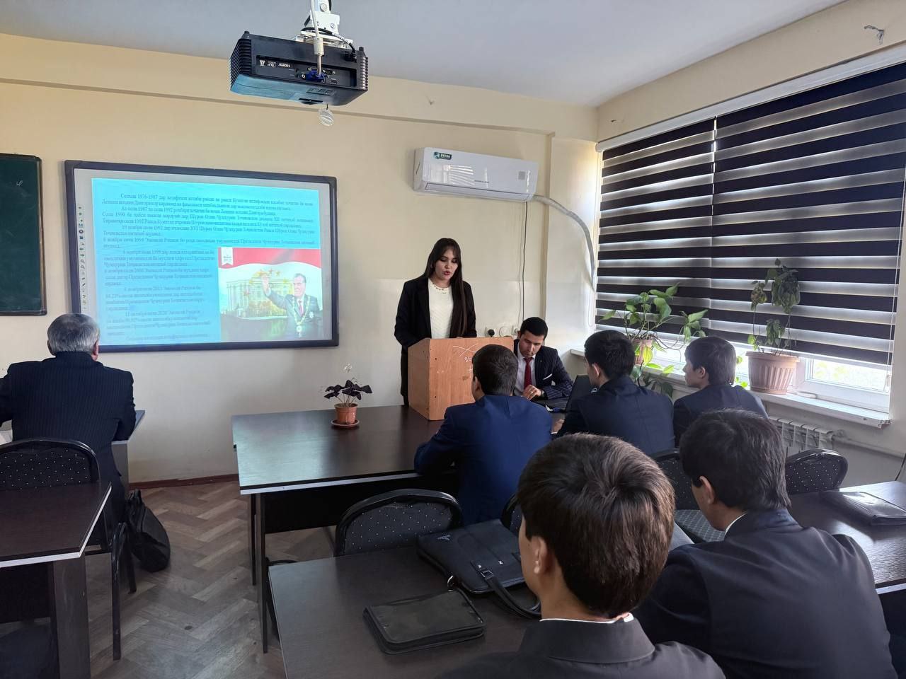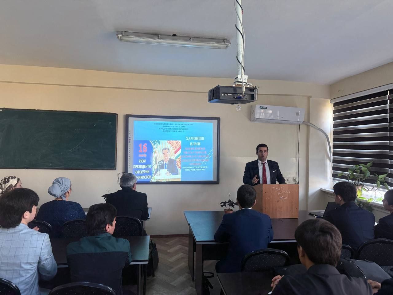 Дар идомаи чорабинӣ мудири кафедра Ҳакимзода А. дар мавзуи “Нақши Пешвои миллат Эмомалӣ Раҳмон дар ташкили давлатдории навини тоҷикон” маърӯза намуда, қайд кард, ки нақши Президенти кишвар муҳтарам Эмомалӣ Раҳмон ба сифати Пешвои миллат ва бунёдгузори давлати миллӣ дар таъмини истиқлолияти давлатӣ ва ҳастию бақои миллати тоҷик, пеш аз ҳама, дар таҳкими пояҳои давлатдории миллӣ, таъмини сулҳу субот ва ваҳдати миллӣ, эҳёи тамаддун, илму фарҳанг ва мактабу маориф, рушди соҳаҳои тандурустӣ ва варзиш, бунёди роҳу нақбҳо, берун баровардан аз бунбасти коммуникатсионӣ ва табдил додани Тоҷикистон ба кишвари транзитӣ, боло бурдани эътибори он дар арсаи байналмилалӣ, бунёдкорӣ ва ободонии шаҳру деҳоти мамлакат, расидан ба истиқлолияти энергетикӣ, таъмини амнияти озуқаворӣ ва дастрасии аҳолӣ ба ғизои хушсифат басо бузург аст.