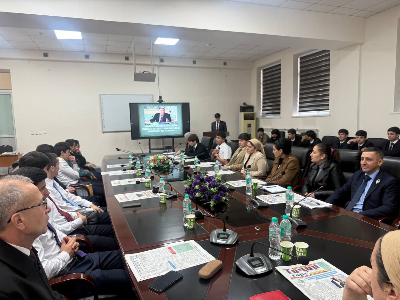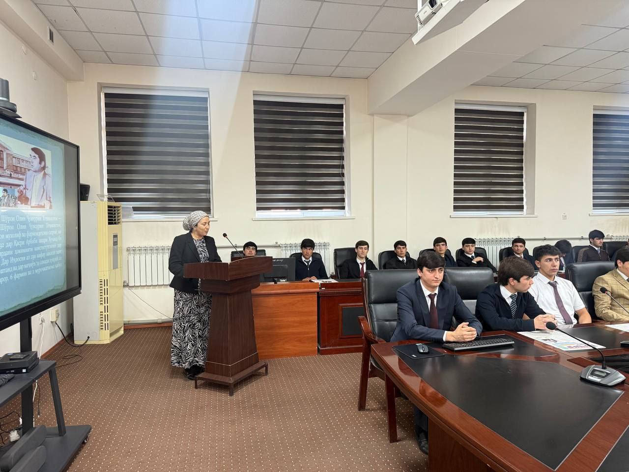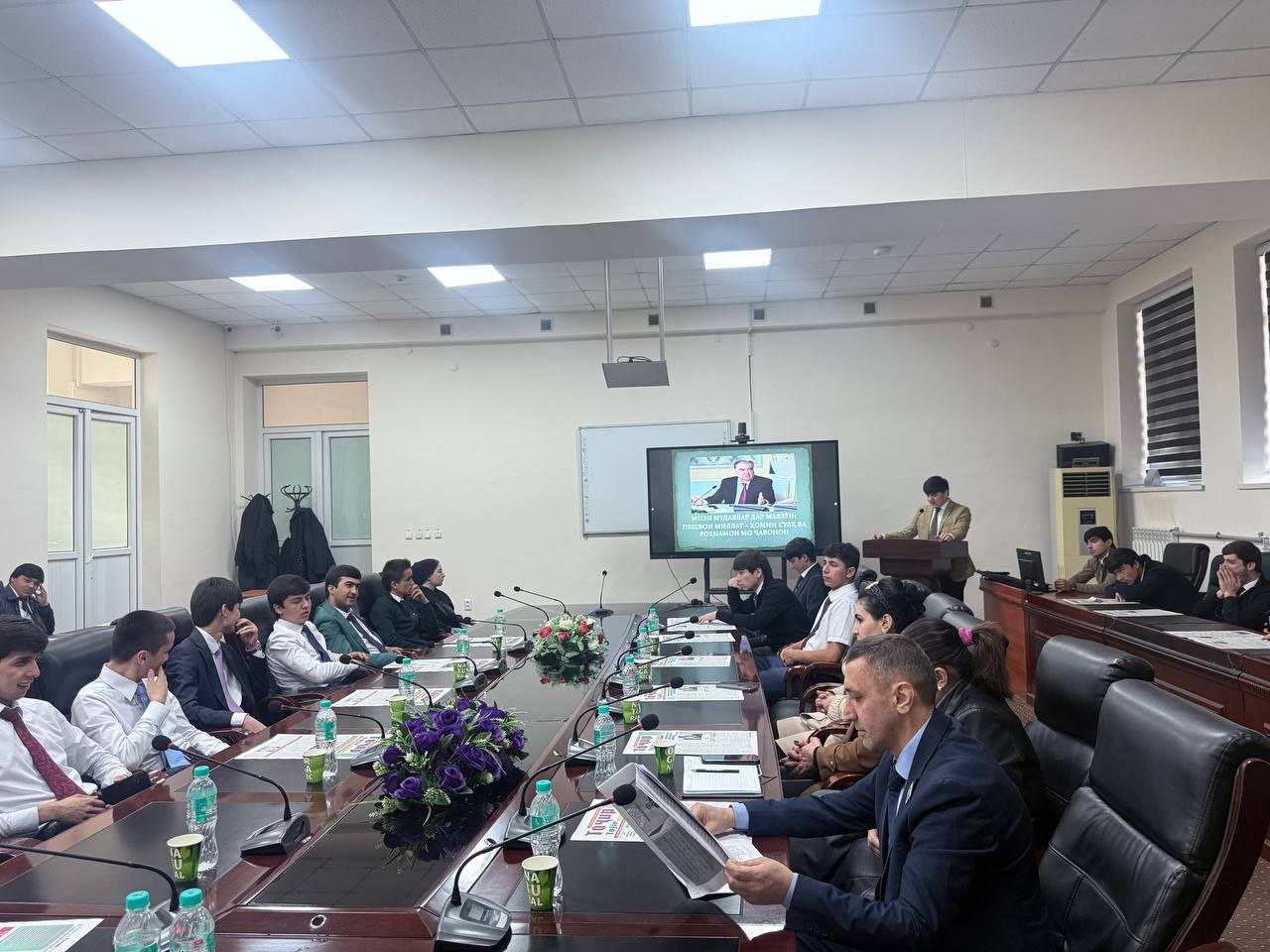 Дар идомаи чорабинӣ омӯзгорони кафедра Раҷабзода Нурҳаёт дар мавзӯи “Нақши Иҷлосияи XVI Шӯрои Олии тақдирсоз дар таърихи навини тоҷикон” ва Парвиз Нидоев дар мавзӯи “Эмомалӣ Раҳмон - Президенти сулҳовар, сулҳпарвар ва ваҳдатофар” суханронӣ намуданд.