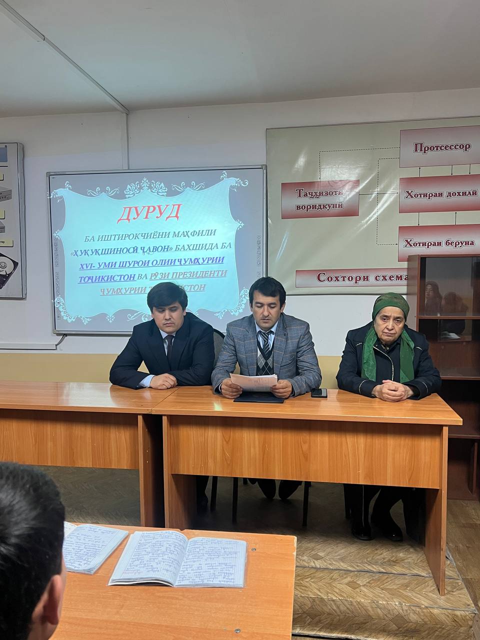 Дар маҳфил иштирокчиён дар мавзӯъҳои “Таърихи ташаккули Иҷлосияи XVI Шурои Олии Ҷумҳурии Тоҷикистон ва аҳаммияти он дар рушди ҳуқуқи миллӣ” ва “Заминаҳои ҳуқуқӣ ва иҷтимоии дастгирии маъюбон дар сиёсати Пешвои миллат муҳтарам Эмомалӣ Раҳмон” баромад намуданд.