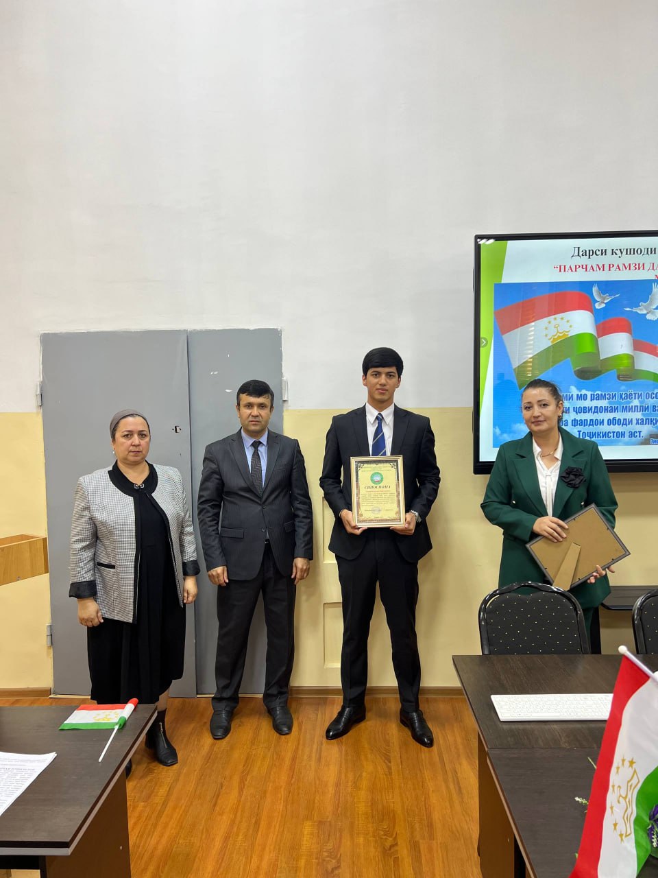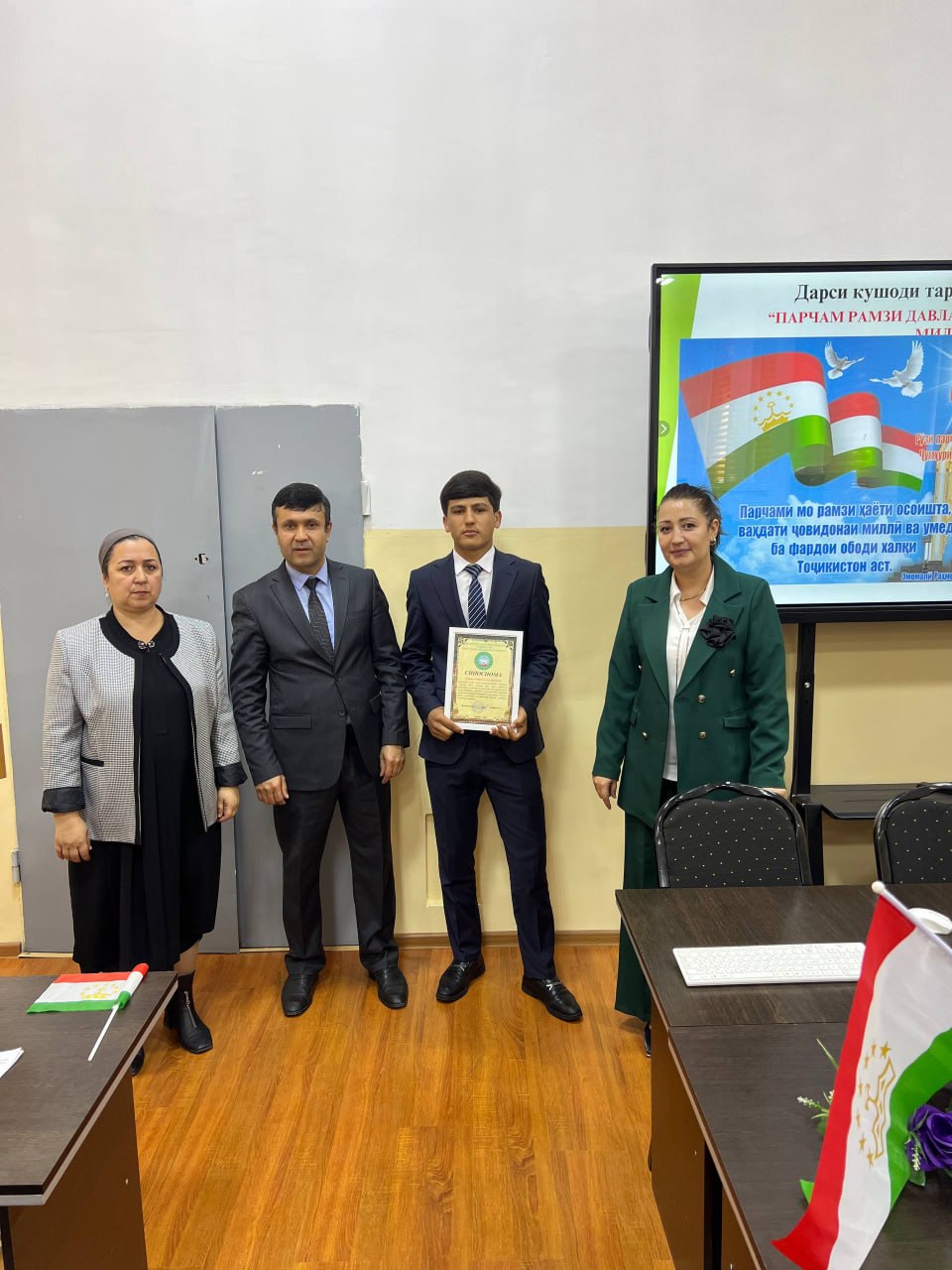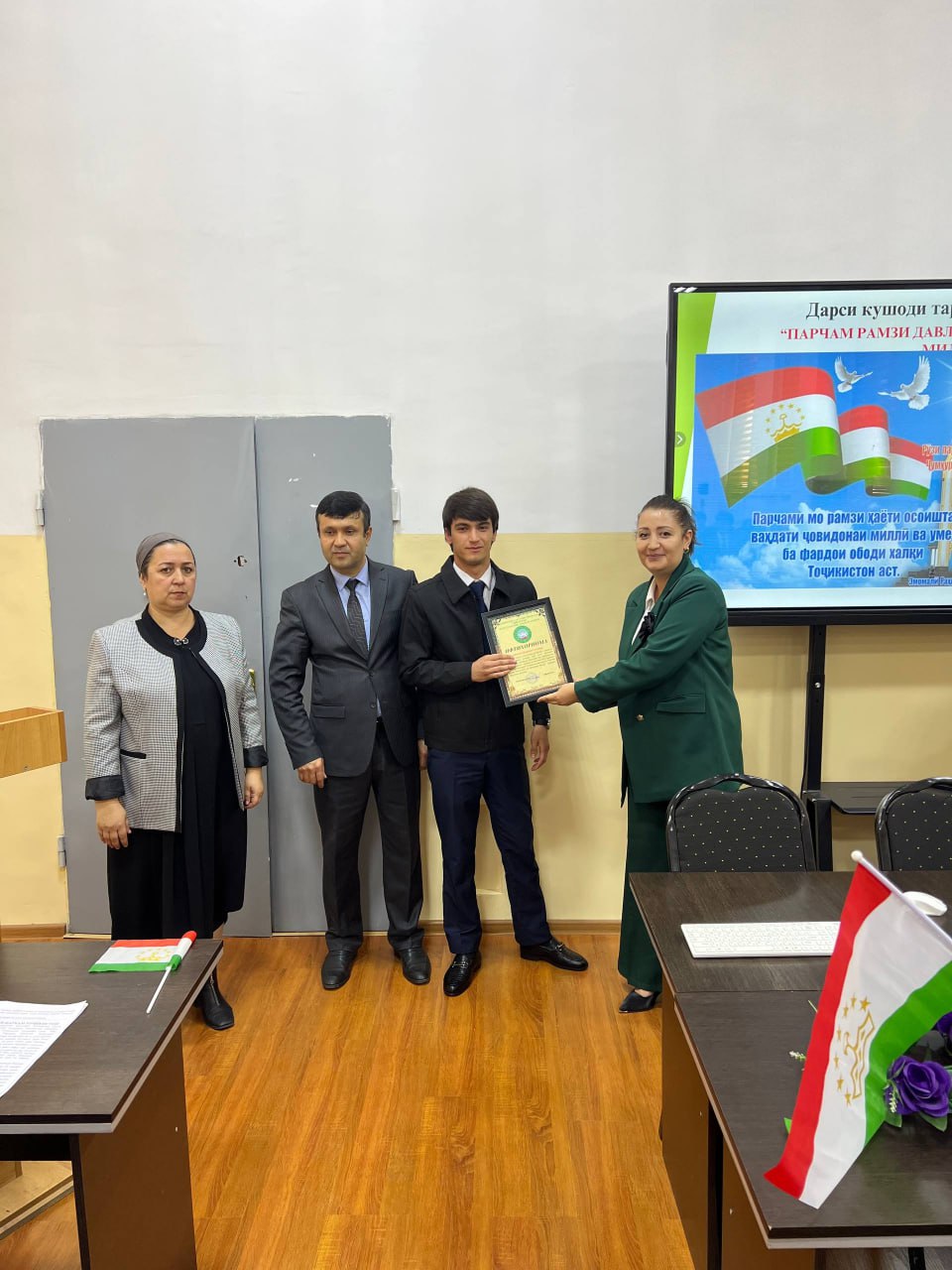 Дарси кушодро омӯзгори кафедра Миҷгона Ашурова оғоз намуда, қайд кард, ки Парчами давлатии Тоҷикистон 24-ноябри соли 1992 дар Иҷлосияи XVI Шурои Олии Ҷумҳурии Тоҷикистон қабул гардида, ҳамчун рамзи давлатдорӣ ва муқаддасоти миллӣ моро ба сӯи созандагию бунёдкорӣ ва саодату хушбахтӣ раҳнамун месозад.