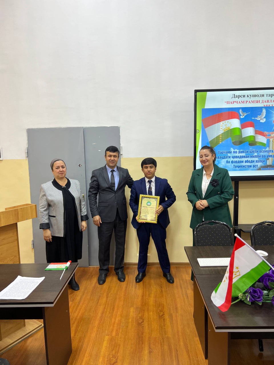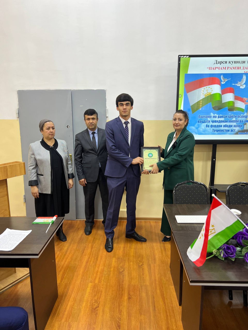 Сипас, донишҷӯён Ориф Маҳмадқулов, Абдуҳалим Ёқубов, Комрон Раҳимов, Муҳаммад Зарипов ва Шӯҳрат Қобилзода доир ба таърихи қабули парчам, аҳаммият ва рисолати парчам ҳамчун муқаддасоти миллӣ маърӯзаҳои пурмазмун карданд. Инчунин, донишҷӯён дар васфи парчами давлатӣ, ватан ва ватандӯстӣ шеърҳо қироат карданд.