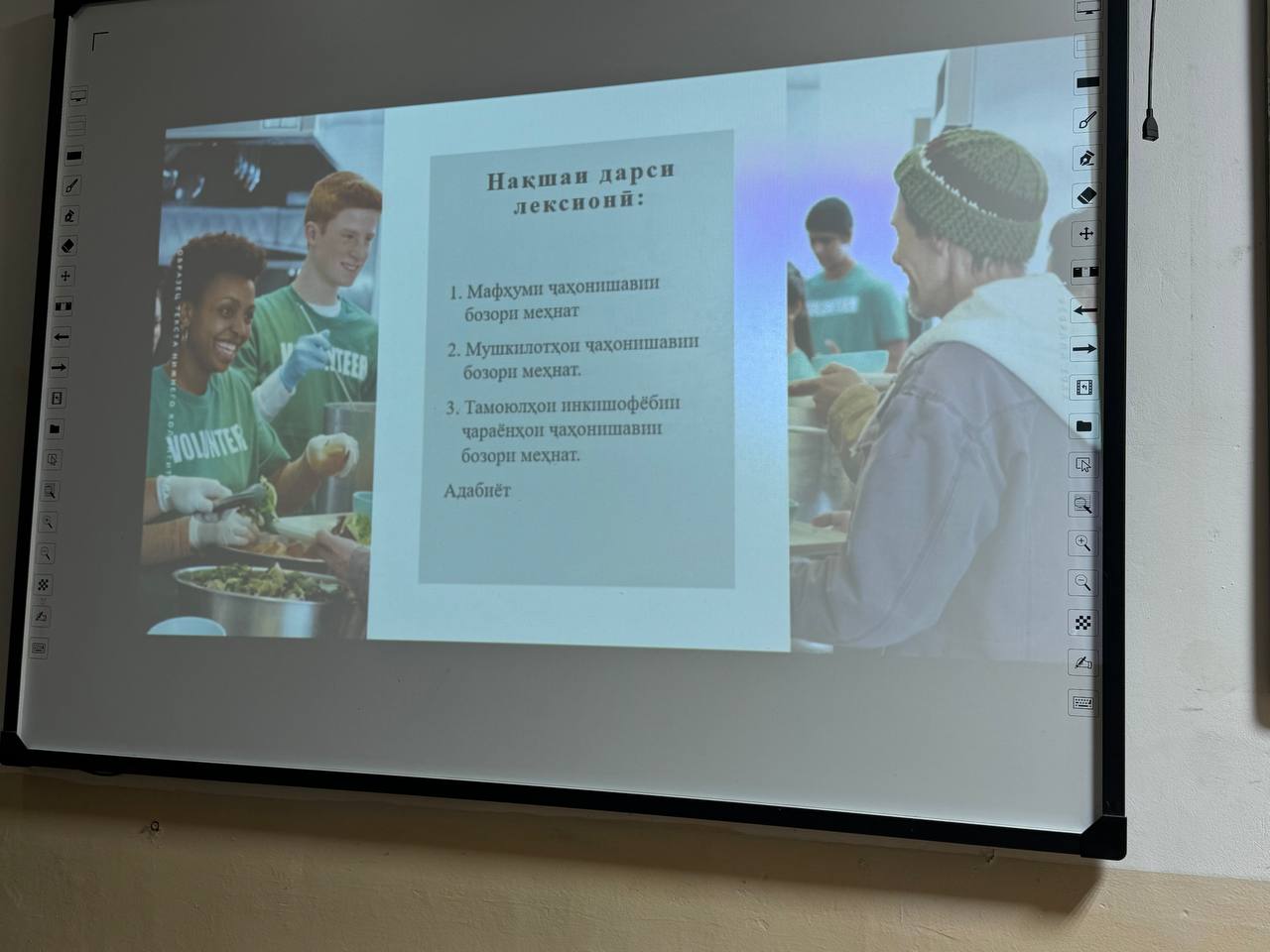 Дар ҷараёни дарс Майсара Назруллозода донишҷӯёнро бо мафҳум ва моҳияти ҷаҳонишавии бозори меҳнат шинос намуда, иброз дошт, ки ҷаҳонишавии бозори меҳнат равандест, ки дар натиҷаи он бозорҳои меҳнати кишварҳо ба ҳам наздик ва муттаҳид шуда, ҳаракати қувваи корӣ, технология, таҷриба ва ҷойҳои кор дар миқёси байналмилалӣ осон ва озод мегардад.