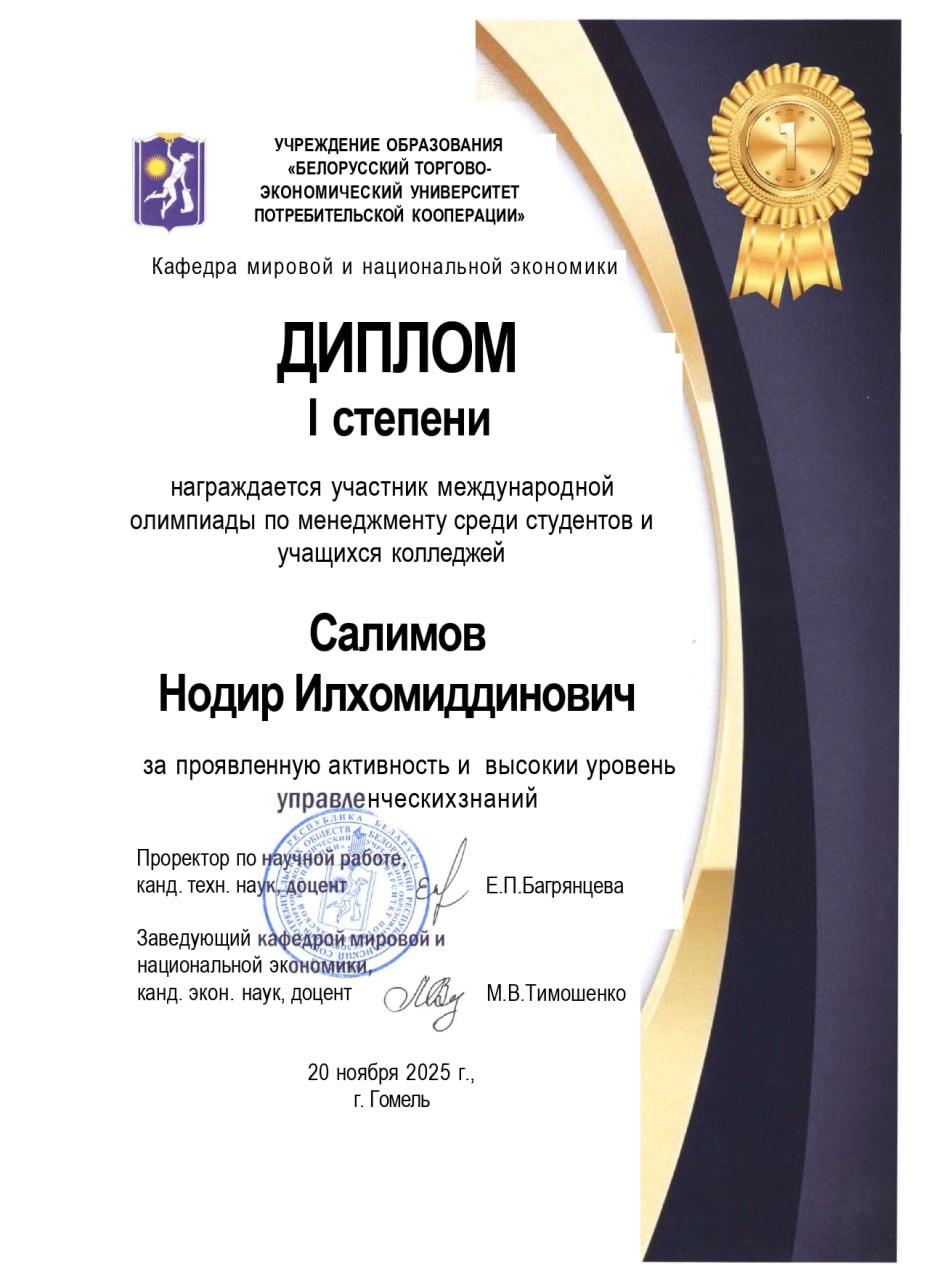 20-уми ноябри соли 2025 дар Донишгоҳи тиҷоратию иқтисодии кооператсияи матлуботи Беларус байни донишҷӯёни 18 муассисаи таҳсилоти олӣ ва миёнаи касбии кишварҳои Иттиҳоди Давлатҳои Мустақил олимпиадаи байналмилалӣ аз фанни менеҷмент баргузор гардид