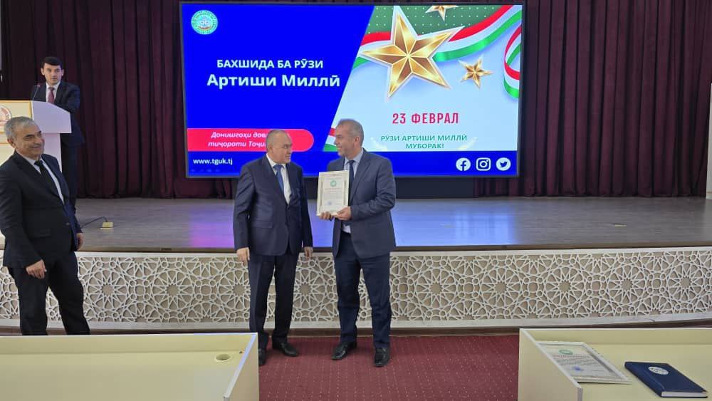 19-уми феврали соли 2026 дар Донишгоҳи давлатии тиҷорати Тоҷикистон ба муносибати 33-юмин солгарди Рӯзи таъсисёбии Қувваҳои Мусаллаҳи Ҷумҳурии Тоҷикистон бо иштироки доираи васеи омӯзгорону донишҷӯёни донишгоҳ ҷамъомади тантанавӣ баргузор гардид.