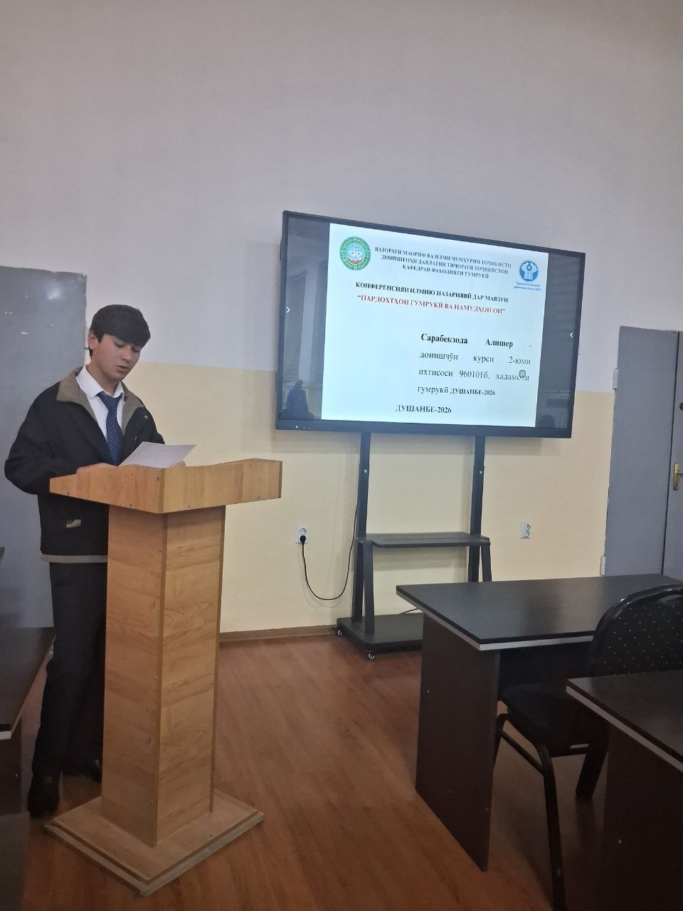 23-юми апрели соли 2026 дар кафедраи фаъолияти гумрукӣ Конференсияи илмию назариявии донишҷӯён бахшида ба 35-солагии Истиқлолияти давлатии Ҷумҳурии Тоҷикистон ва Соли вусъат додани корҳои ободонию созандагӣ ва тақвияту таҳкими худшиносиву худогоҳии миллӣ баргузор гардид.