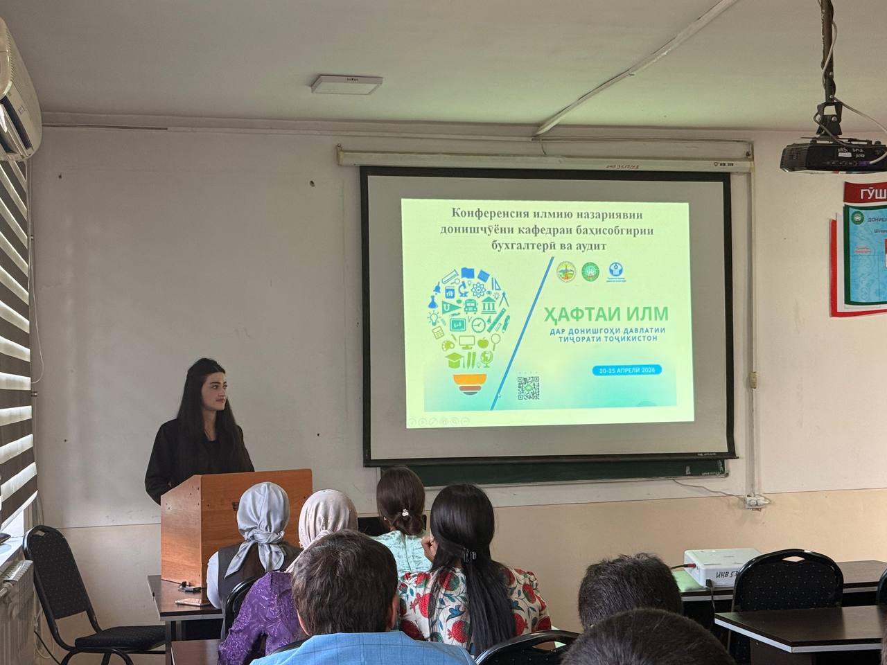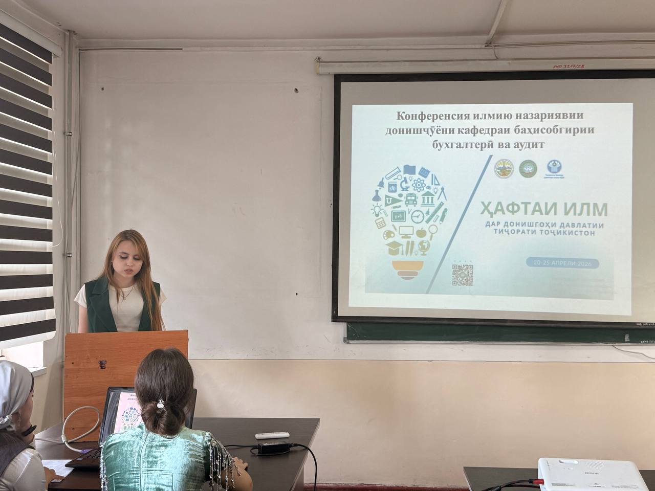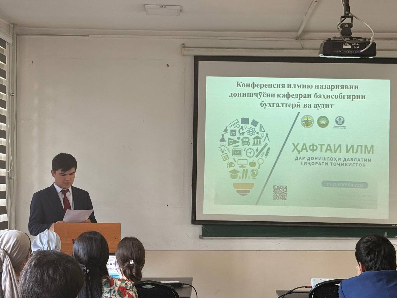 24-уми апрели соли 2026 дар кафедраи баҳисобгирии бухгалтерӣ ва аудит конференсияи илмию назариявии донишҷӯён (бахши “Баҳисобгирии муҳосибӣ”) бахшида ба 35-солагии Истиқлолияти давлатии Ҷумҳурии Тоҷикистон ва Соли вусъат додани корҳои ободонию созандагӣ ва тақвияту таҳкими худшиносию худогоҳии миллӣ” баргузор гардид.