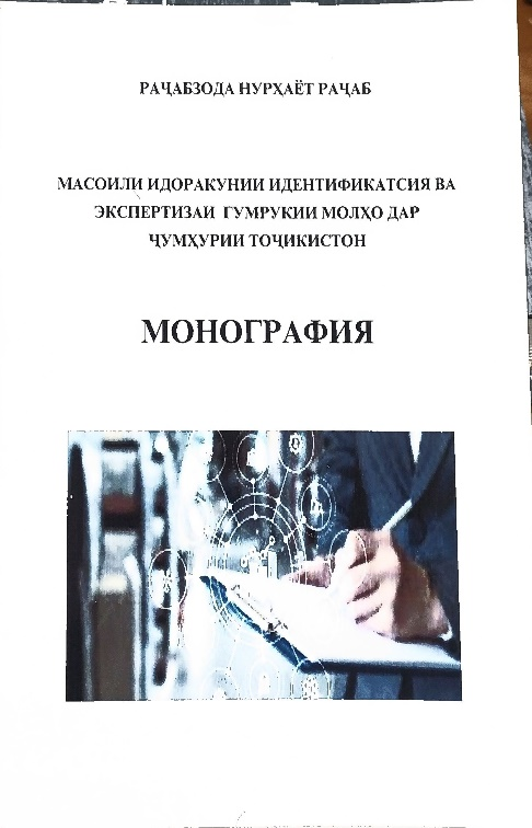 МАСОИЛИ ИДОРАКУНИИ ИДЕНТИФИКАТСИЯ ВА ЭКСПЕРТИЗАИ ГУМРУКИИ МОЛҲО ДАР ҶУМҲУРИИ ТОҶИКИСТОНМонография. Раҷабзода Нарҳаёт Раҷаб ББК 67.401.21+65.428(25 точик) +65.5+92 я2 УДК 336.221+337+330.13+327 точик Р-48 ISBN 978-99975-982-7-6 Нашриёт :«Абдураҳмон-Р» Саҳифа- 189с. Соли нашр 2024. Масоили идоракунии идентификатсия ва экспертизаи гумрукии молҳо дар Ҷумҳурии Тоҷикистон.Монография.--Душанбе:«Абдураҳмон-Р»,2024.-189 саҳ. Монография ба тавсифи масоили идоракунии идентификатсия ва экспертизаи гумрукии молҳо дар шароити муосир бахшида шудааст. Дар монография асосҳои назариявӣ ва методологияи ташакул ва рушди экспертизаи гумрукии молҳо, ташаккули механизми идоракунии идентификатсияи молҳо ба мақсадҳои гумрукӣ, инчунин самтҳои асосии такмили механизми хизматрасонии экспертизаи гумрукии молҳо дар Ҷумҳурии Тоҷикистон дида баромада шудаанд. Монографияи мазкур барои донишҷӯён, магистрон, аспирантон, докторантон, унвонҷӯён ва мутахассисони соҳаи фаъолияти гумрукӣ пешниҳод гардидааст |