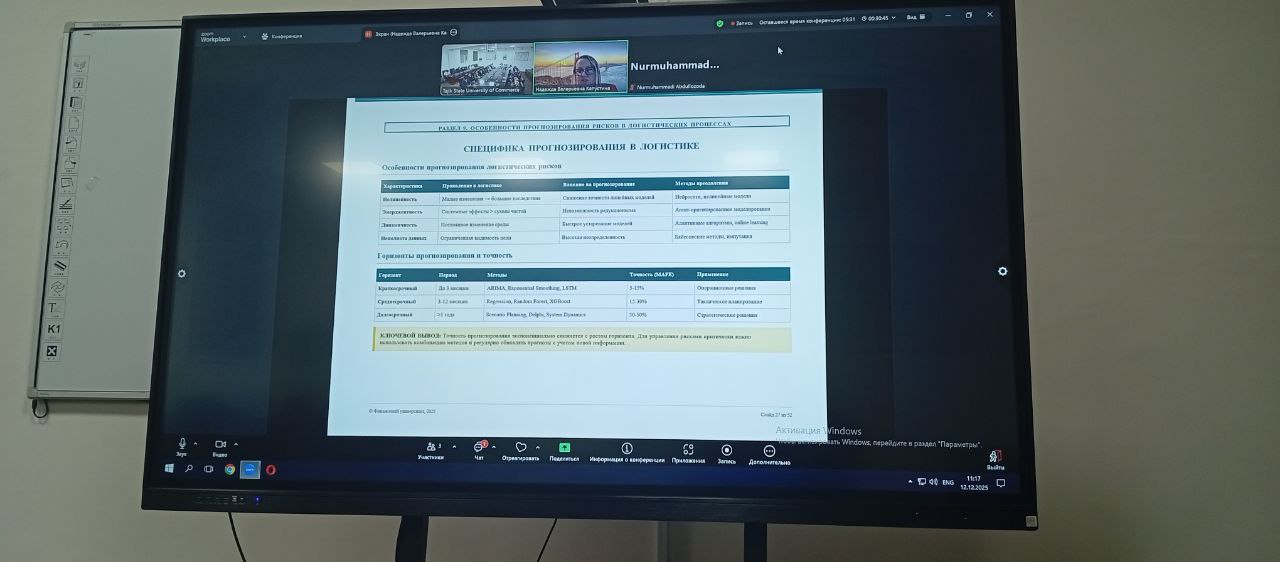 Санаи 12-уми декабри соли 2025 шуъбаи ҳамкориҳои байналмилалӣ, татбиқи лоиҳаҳо ва табодули академӣ дар якҷоягӣ бо кафедраи менеҷмент, маркетинг ва иқтисодиёти меҳнат дарси маҷозиро дар ҳамкорӣ бо Донишгоҳи молияи назди Ҳукумати Федератсияи Россия баргузор намуданд.