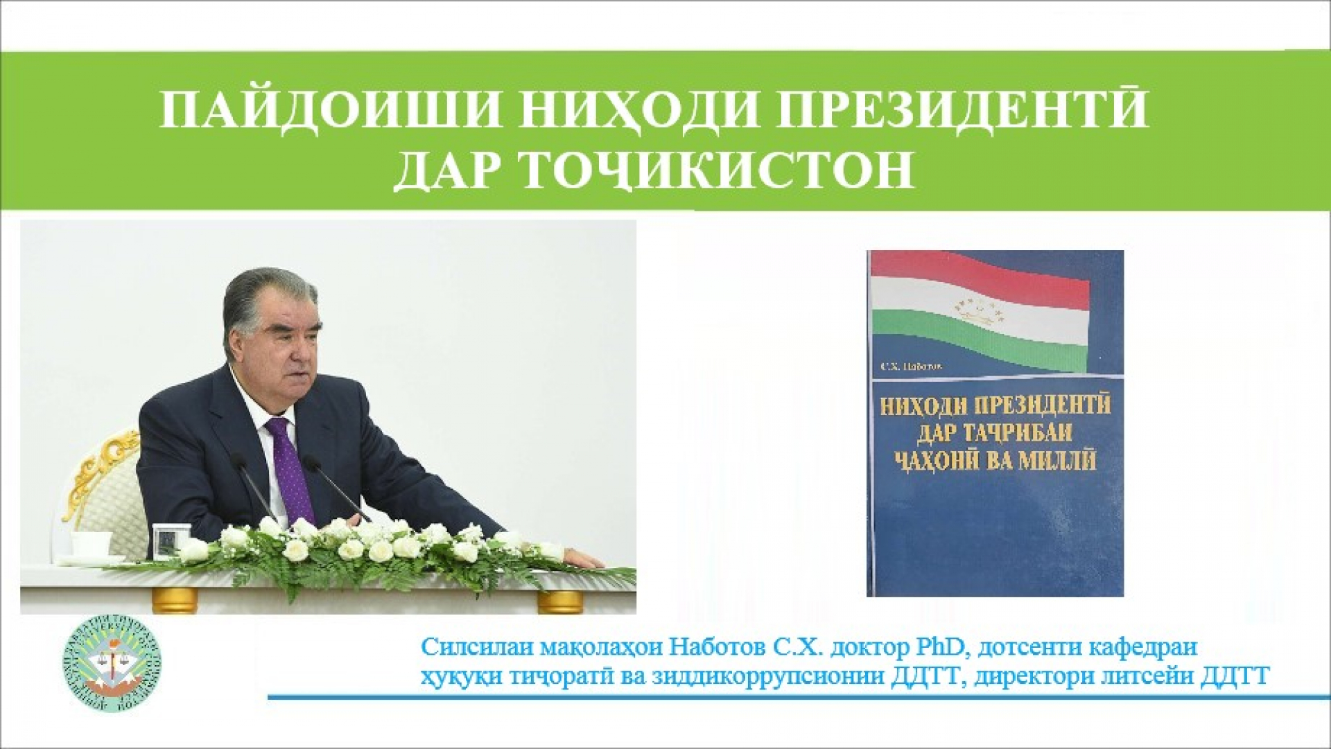 Наботов С.Х. доктори ҳуқуқ, дотсенти кафедраи ҳуқуқи тиҷоратӣ ва зиддикоррупсионии ДДТТ, директори литсейи ДДТТ