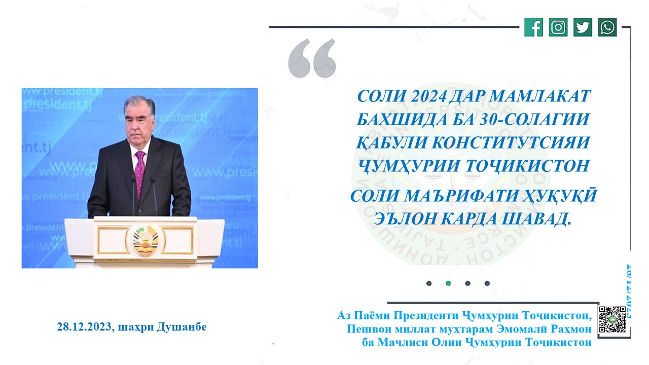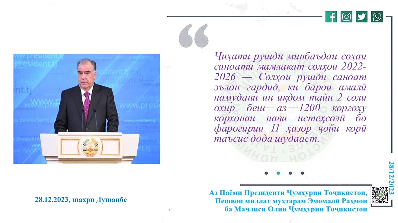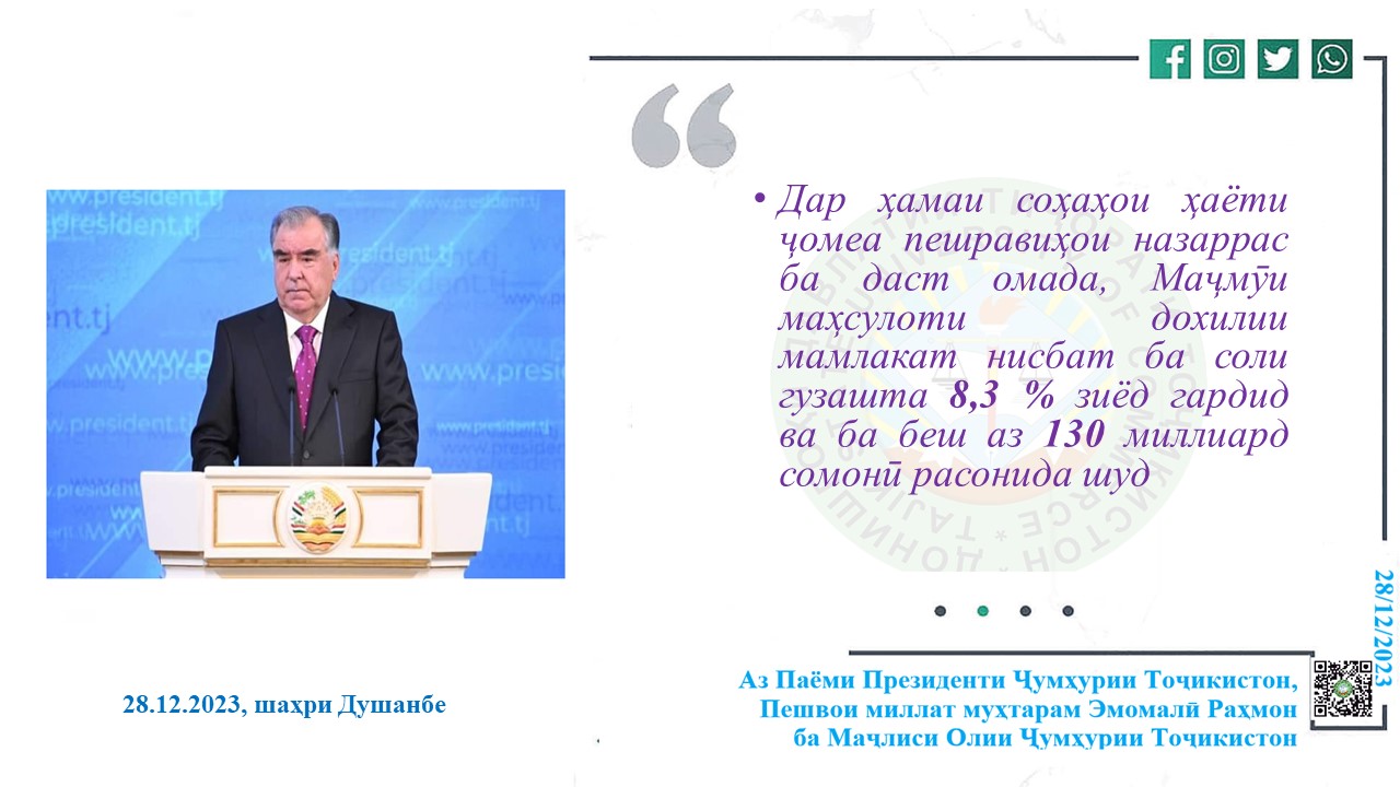 Дар Паёми Президенти Ҷумҳурии Тоҷикистон ба Маҷлиси Олии Ҷумҳурии Тоҷикистон «Дар бораи самтҳои асосии сиёсати дохилӣ ва хориҷии ҷумҳурӣ» аз 28 декабри соли 2023 вобаста ба рушди босуботи иқтисоди миллӣ чунин омадааст: “Дар ҳамаи соҳаҳои ҳаёти ҷомеа пешравиҳои назаррас ба даст омада, маҷмӯи маҳсулоти дохилии кишвар нисбат ба соли гузашта 8,3 фоиз зиёд гардид ва ба беш аз 130 миллиард сомонӣ расонида шуд”. Чи гунае, ки таъкид гардид, қисми даромади буҷети давлатӣ 102,5 фоиз таъмин гардида, масъалаҳои вобаста ба рушди соҳаҳои иқтисодиву иҷтимоии кишвар тадбирҳои мушаххасро роҳандозӣ гардидааст.