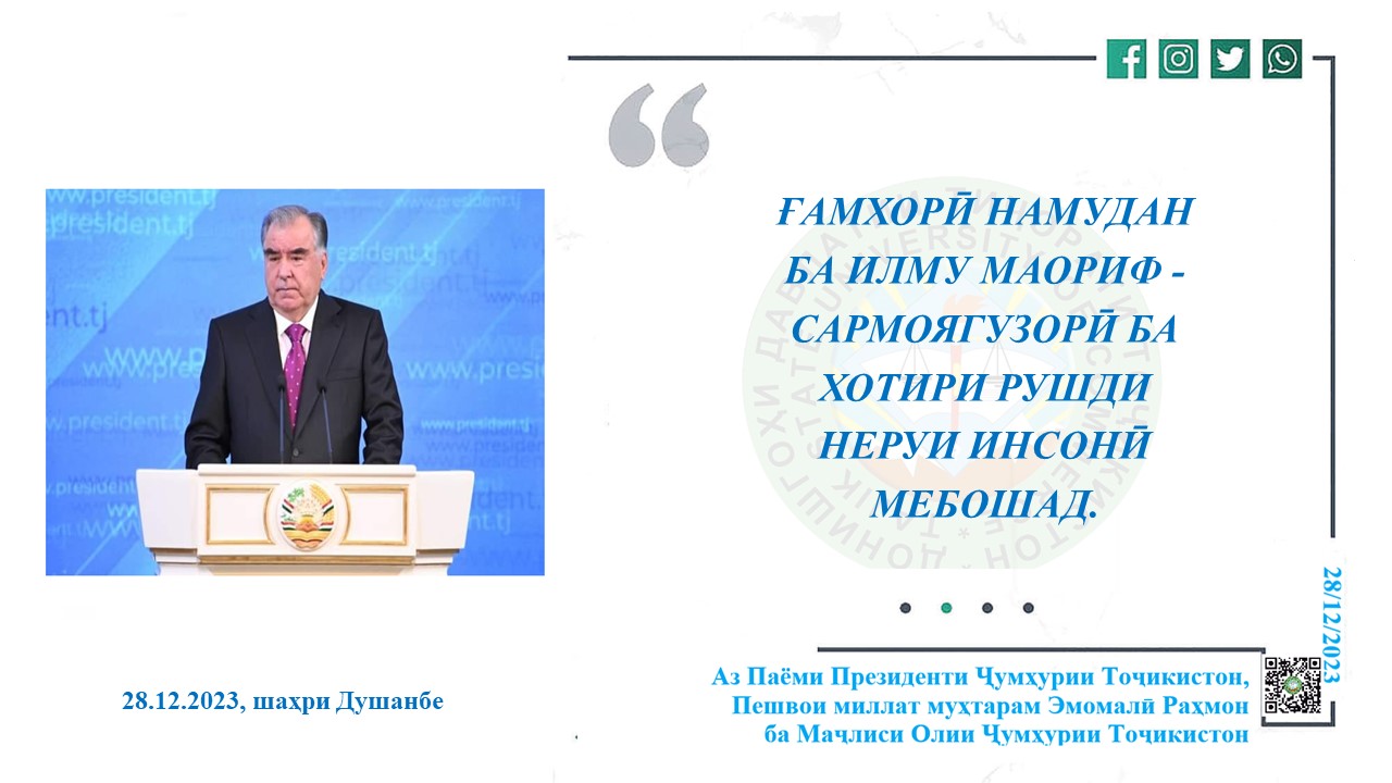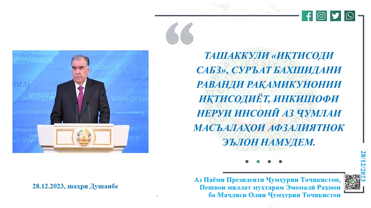 Пешниҳоди дахлдор имрӯз зимни ироаи Паёми Президенти Ҷумҳурии Тоҷикистон муҳтарам Эмомалӣ Раҳмон ба Маҷлиси Олии Ҷумҳурии Тоҷикистон манзур гардонида таъкид гардид, ки ташаккули «иқтисоди сабз», суръат бахшидани раванди рақамикунонии иқтисодиёт, инкишофи неруи инсонӣ, баланд бардоштани рақобатнокии маҳсулоти ватанӣ, тақвияти имкониятҳои содиротии мамлакат ва беҳтар гардонидани сифати хизматрасониҳои иҷтимоиро аз ҷумлаи масъалаҳои афзалиятнок эълон намудем.