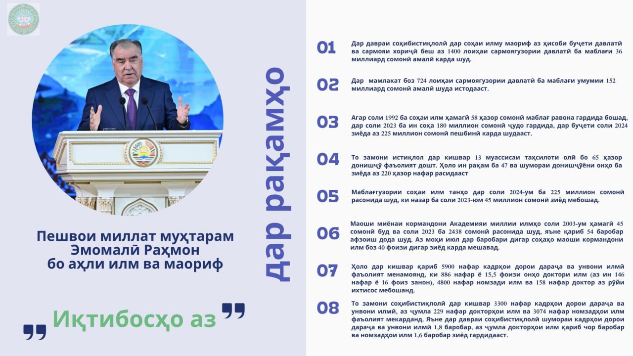 Бо талошҳои Пешвои миллат, муҳтарам Эмомалӣ Раҳмон ва Ҳукумати мамлакат, Ҷумҳурии Тоҷикистон дар тӯли даврони соҳибистиқлолӣ дар соҳаҳои илму маориф ба дастовардҳои назаррас ноил гардид. Бар асоси ин талошҳо, кишвар тавонист, ки шумораи муассисаҳои таҳсилоти умумӣ ва олии касбиро ба таври назаррас афзоиш дода, муҳити мусоид барои таҳсил ва таҳқиқот фароҳам оварад. Ҷалби сармояи дохиливу хориҷӣ барои рушди илму маориф низ аз ҷумлаи дастовардҳои муҳими ин давра мебошад.