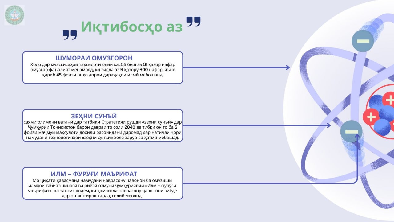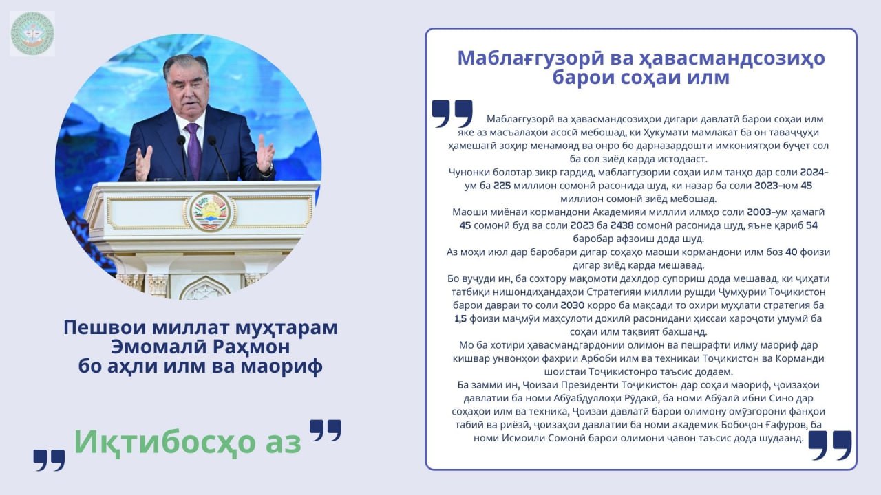 Тӯли беш аз се даҳсола, Пешвои миллат муҳтарам Эмомалӣ Раҳмон дар рушди илму маориф дар Тоҷикистони соҳибистиқлол нақши муҳим ва арзанда доранд. Талошҳои шабонарӯзии Сарвари давлат боиси рушди босуръати соҳаҳои илмӣ ва таълимӣ дар кишвар гардиданд. Бо мақсади тақвияти заминаҳои моддиву техникии илми ватанӣ, Ҳукумати ҷумҳурӣ маблағгузорӣ ба ин соҳаро ба таври назаррас афзоиш дод. Ҷудо гардидани 1 миллиарду 607 миллион сомонӣ барои ин соҳа имконият фароҳам овард, ки сохтори Академияи илмҳо мукаммал гардонида шавад. Ин раванд соли 2020 ба таъсиси Академияи миллии илмҳо анҷомид.