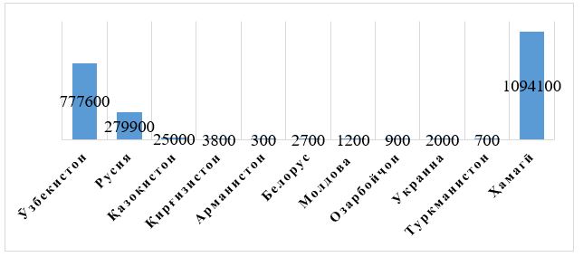Миқдори зиёди шаҳрвандони хориҷии ба ҷумҳурӣ воридшуда, аз давлатҳои ҳамсоя, аз ҷумла, аз Ӯзбекистон-777,6 ҳазор нафар (71,0%), Русия-279,9 ҳазор нафар (25,6%), Қазоқистон-25,0 ҳазор нафар (2,3%), Қирғизистон-3,8 ҳазор нафар (0,3%) ва ғайра мебошанд.