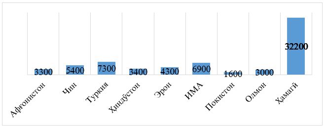 Расми 4. Шумораи шаҳрвандони хориҷие, ки ба ҳайси сайёҳ ба Ҷумҳурии Тоҷикистон аз мамлакатҳои хориҷи дур ворид шудаанд (дар соли 2022, ҳаз. нафар)