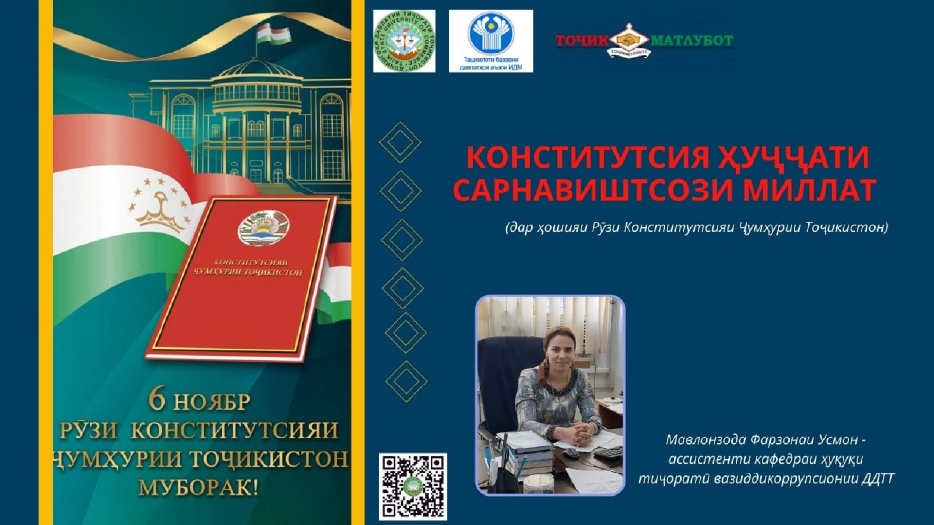 Бо шарофати соҳибистиқлолии кишвар ва сулҳу суббот дар мамлакат имсол мо 30-юмин солгарди Рӯзи Конститутсияи Ҷумҳурии Тоҷикистонро бо тантана ҷашн мегирем, ки он 6 ноябри соли 1994 бо роҳи раъйпурсии умумихалқӣ қабул гардида, аз 10 боб ва 100 модда иборат аст.