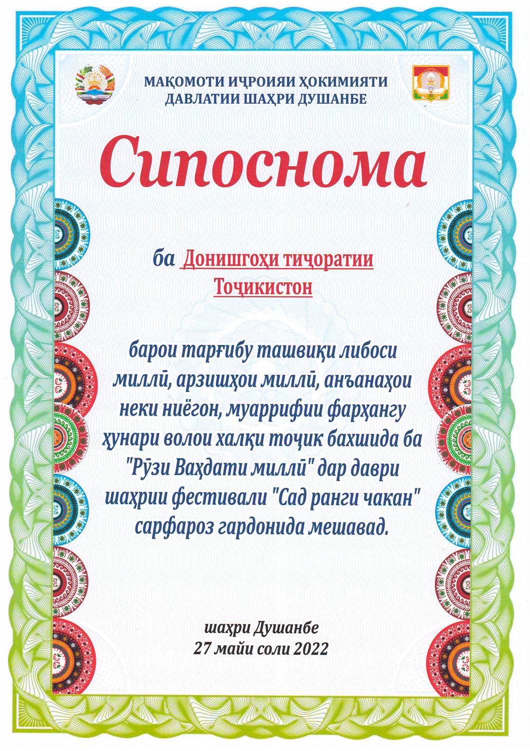 Дар фарҷоми чорабинии идона аз ҷониби Мақомоти иҷроияи Ҳокимияти давлатии шаҳри Душанбе ба Донишгоҳи давлатии тиҷорати Тоҷикистон барои тарғибу ташвиқи либосу арзишҳои миллӣ, анъанаҳои неки ниёгон ва муаррифии фарҳангу ҳунари волои халқи тоҷик сипоснома ва туҳфаи хотиравӣ тақдим карда шуд.