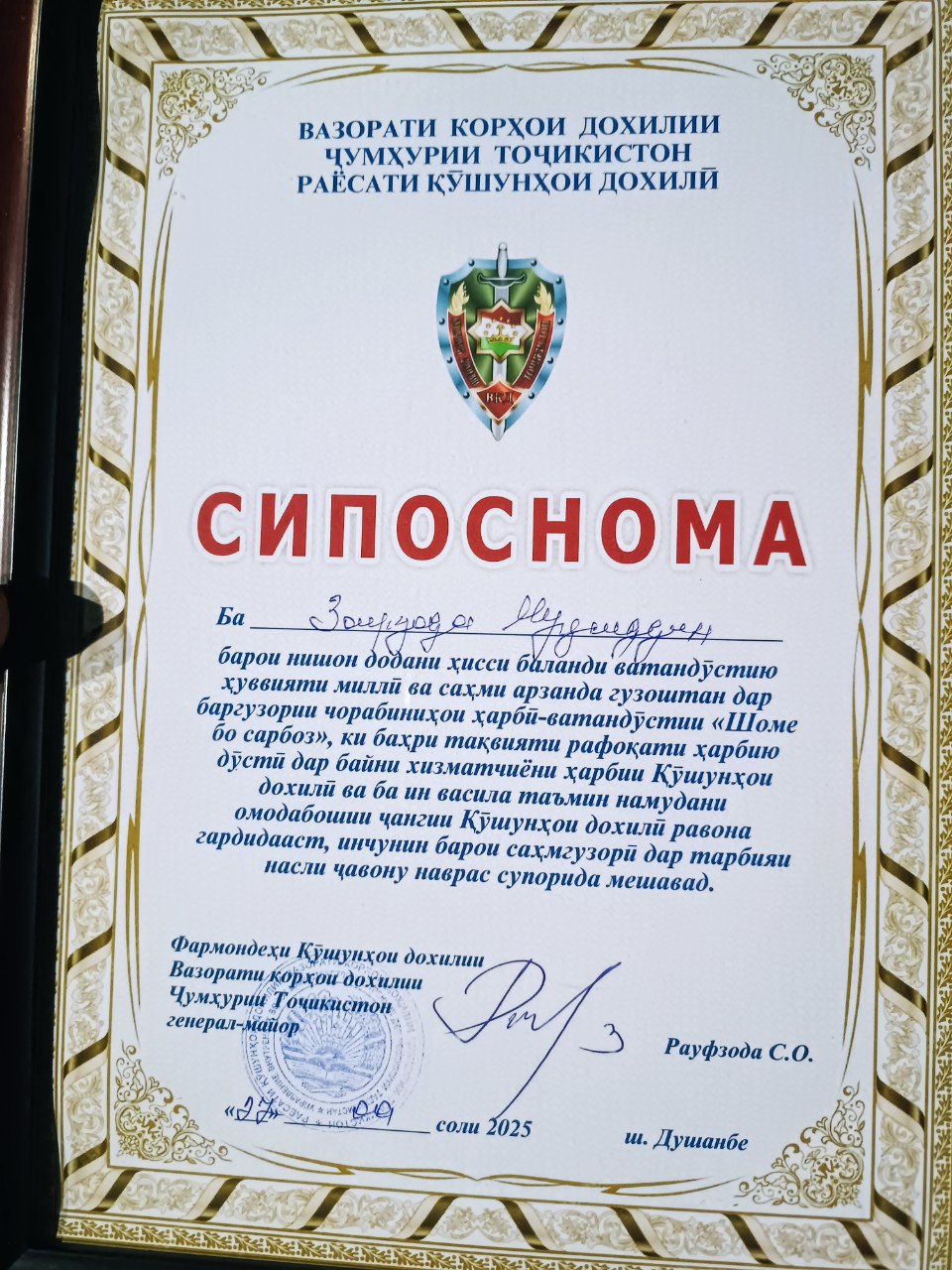 Дар фарҷоми чорабинӣ 3 нафар донишҷӯёни донишгоҳ аз ҷониби Фармондеҳи Қӯшунҳои дохилии Вазорати корҳои дохилии Ҷумҳурии Тоҷикистон генерал-майёр Рауфзода С.О. бо сипосномаҳо қадрдонӣ карда шуданд.