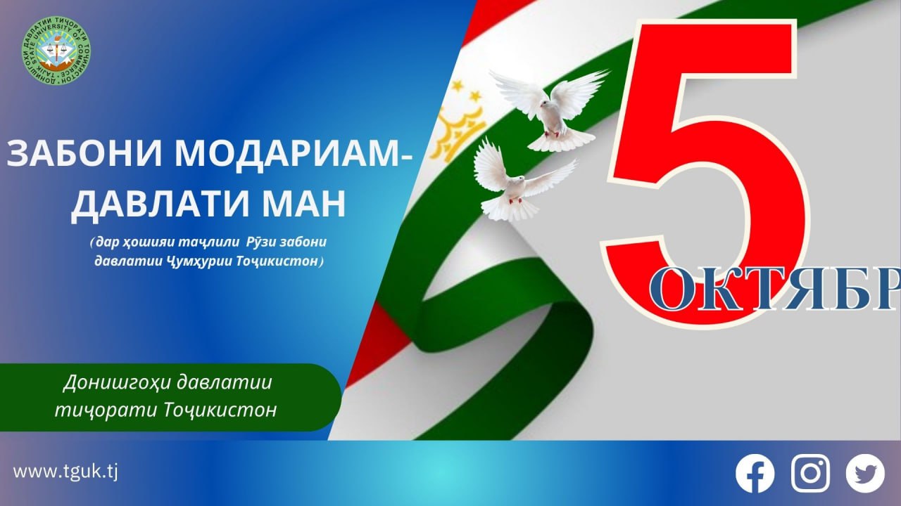 Ҳамаи шуморо аз номи раёсати донишгоҳ ба муносибати Рӯзи забони давлатӣ ва Рӯзи омӯзгор, ки имсол ҳарду ҷашн ба 5-уми октябр рост меоянд, самимона шодбош мегӯям.