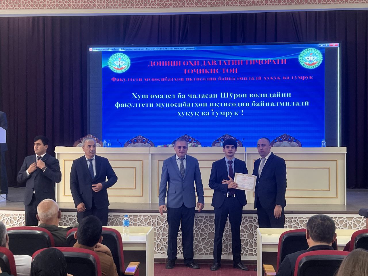 Дар фарҷоми ҷаласа чанде аз донишҷӯёне, ки тариқи имтиҳонҳои Маркази миллии тестии назди Президенти Ҷумҳурии Тоҷикистон ба донишгоҳ дохил шуданд ва дар чорабиниҳои таълимӣ, илмӣ, тарбиявӣ ва ҷамъиятии донишгоҳ фаъолона иштирок менамоянд, бо сипосномаҳои раёсати донишгоҳ қадрдонӣ карда шуданд.