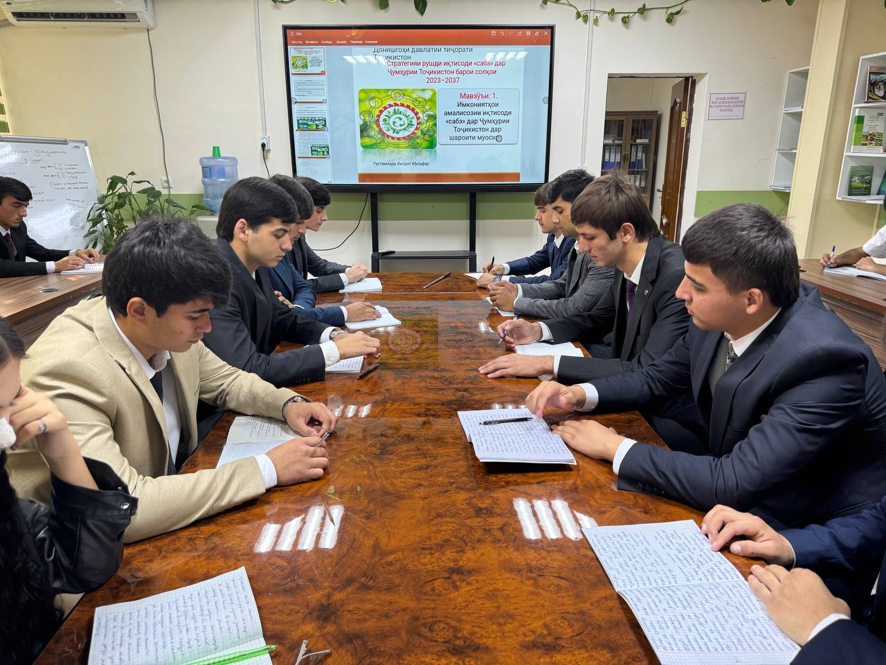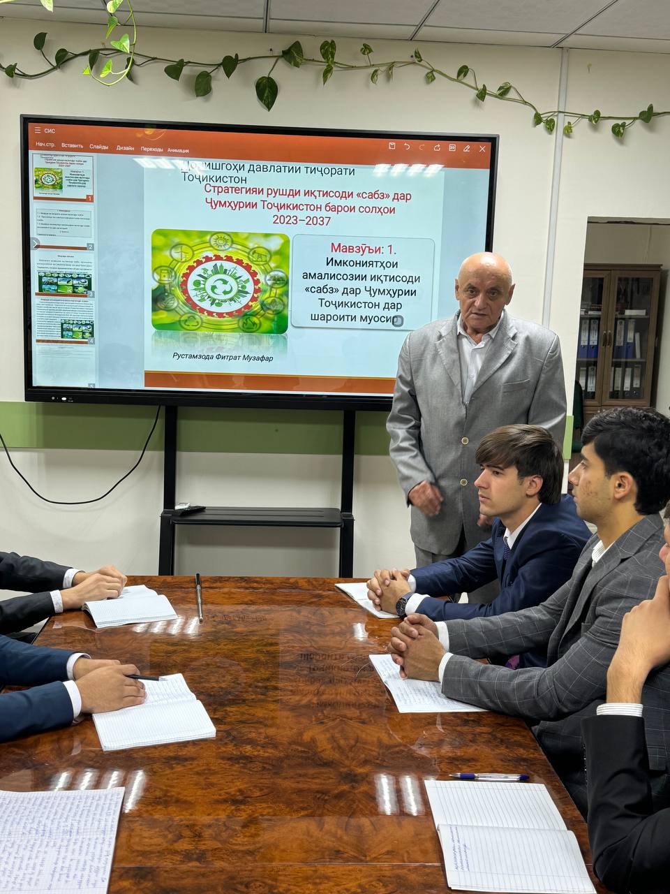 Дар ҷараёни дарс Рустамзода Фитрат Музафар донишҷӯёнро бо мафҳум ва моҳияти иқтисоди "сабз", принсипҳои он ва амалисозии иқтисоди "сабз" дар Ҷумҳурии Тоҷикистон шинос намуда, иброз дошт, ки Стратегияи рушди иқтисоди "сабз" дар Ҷумҳурии Тоҷикистон барои солҳои 2023–2037 бо мақсади таъмини рушди иқтисодӣ аз ҳисоби истифодаи самаранок ва оқилонаи захираҳои табиӣ, баланд бардоштани сатҳу сифати зиндагии аҳолӣ ва суботи иҷтимоӣ, инчунин таъмини баробарии экологӣ дар давраи дарозмуҳлат таҳия гардидааст.