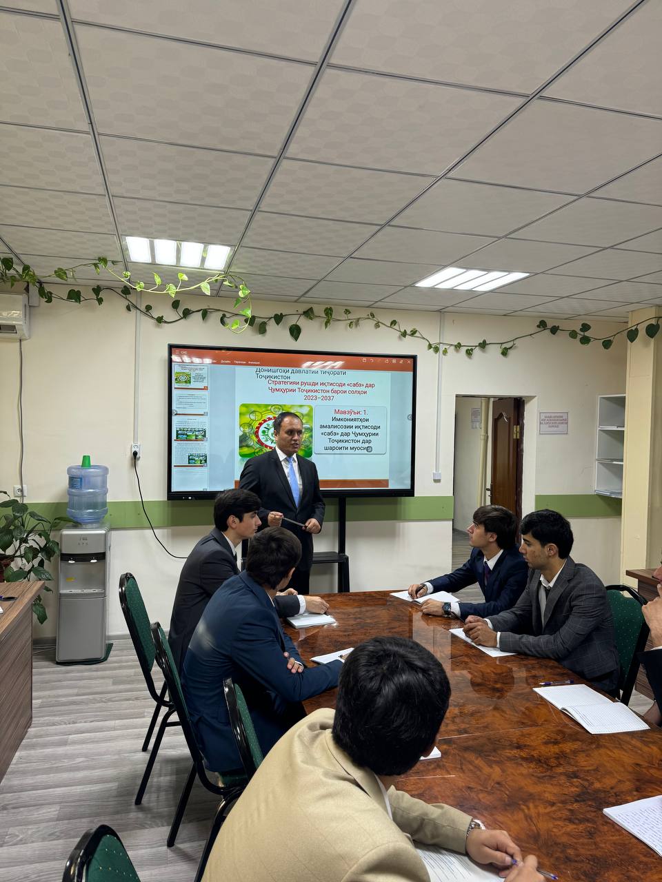 Санаи 28.10.2025 тибқи ҷадвали гузаронидани дарсҳои кушод дар синфхонаи "Иқтисоди сабз"-и донишгоҳ мудири кафедраи иқтисодиёти ҷаҳон ва муносибатҳои байналмилалӣ н.и.и., дотсент Рустамзода Фитрат Музафар дарси кушод бо истифода аз усулҳои фаъоли таълим ва воситаҳои техникии муосир барои донишҷӯёни курси 1-уми ихтисоси 230101 – муносибатҳои байналмилалӣ дар мавзӯи "Имкониятҳои амалисозии иқтисоди "сабз" дар Ҷумҳурии Тоҷикистон дар шароити муосир" гузаронид.