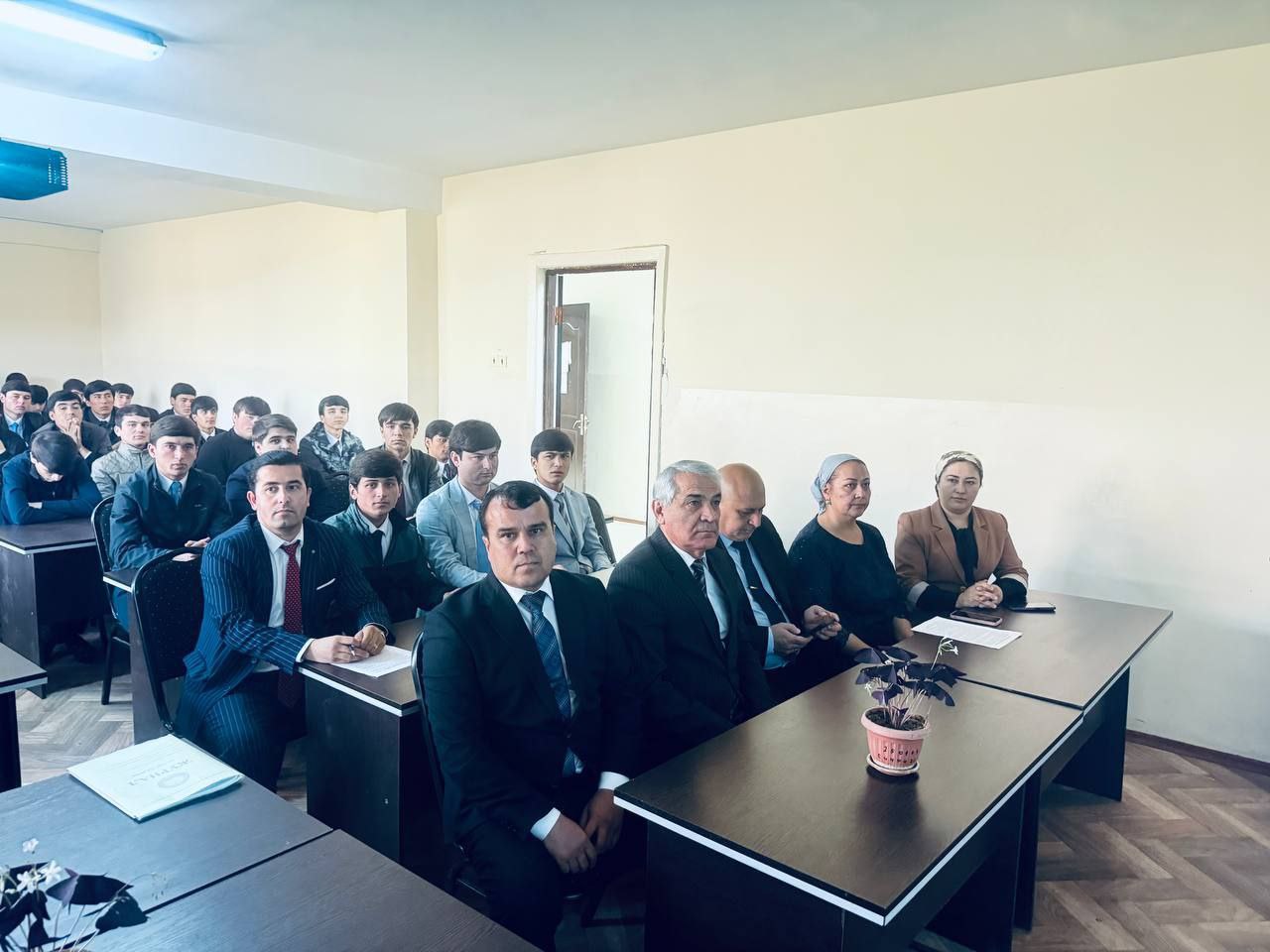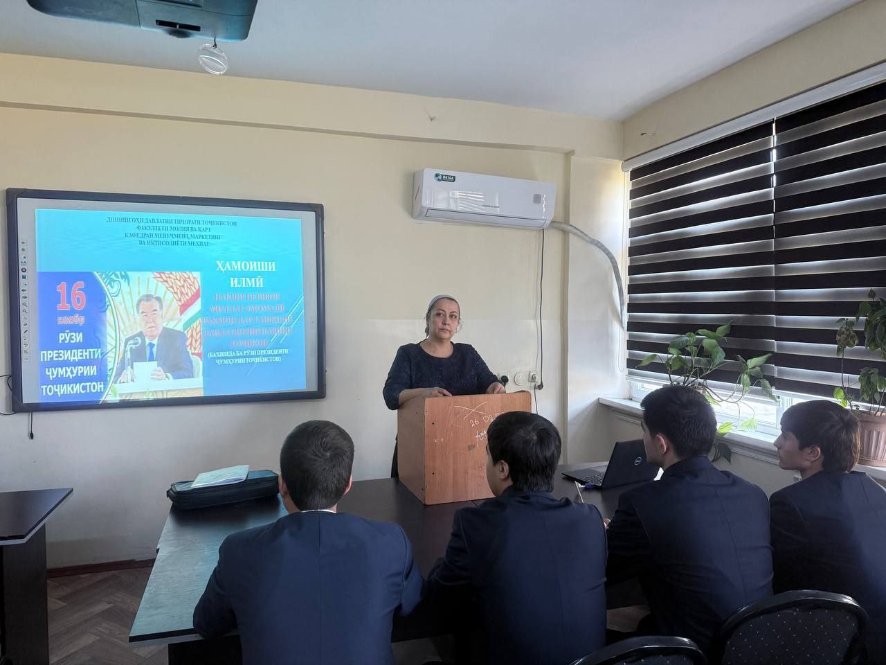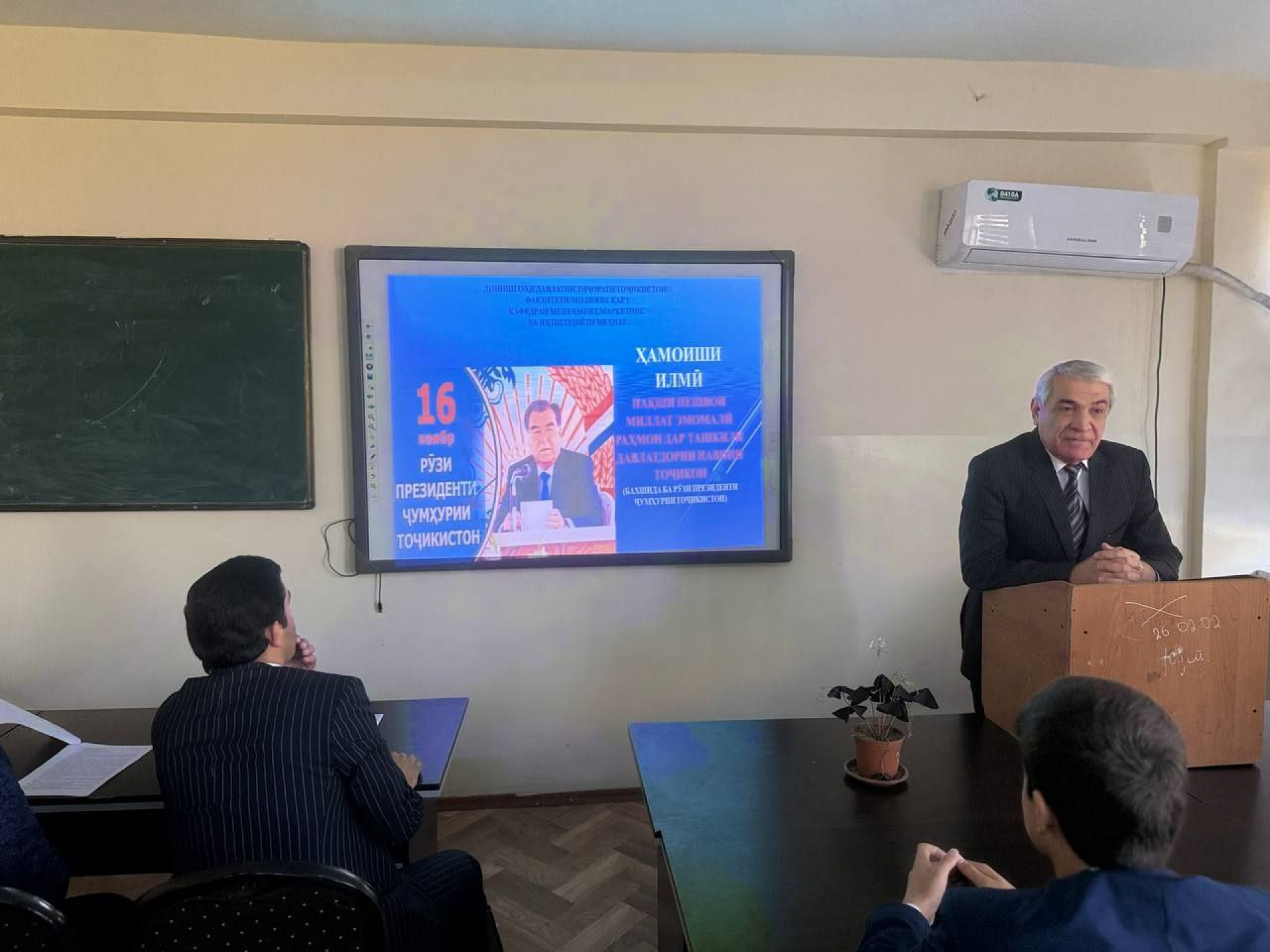 Дар идомаи чорабинӣ мудири кафедра Ҳакимзода А. дар мавзуи “Нақши Пешвои миллат Эмомалӣ Раҳмон дар ташкили давлатдории навини тоҷикон” маърӯза намуда, қайд кард, ки нақши Президенти кишвар муҳтарам Эмомалӣ Раҳмон ба сифати Пешвои миллат ва бунёдгузори давлати миллӣ дар таъмини истиқлолияти давлатӣ ва ҳастию бақои миллати тоҷик, пеш аз ҳама, дар таҳкими пояҳои давлатдории миллӣ, таъмини сулҳу субот ва ваҳдати миллӣ, эҳёи тамаддун, илму фарҳанг ва мактабу маориф, рушди соҳаҳои тандурустӣ ва варзиш, бунёди роҳу нақбҳо, берун баровардан аз бунбасти коммуникатсионӣ ва табдил додани Тоҷикистон ба кишвари транзитӣ, боло бурдани эътибори он дар арсаи байналмилалӣ, бунёдкорӣ ва ободонии шаҳру деҳоти мамлакат, расидан ба истиқлолияти энергетикӣ, таъмини амнияти озуқаворӣ ва дастрасии аҳолӣ ба ғизои хушсифат басо бузург аст.