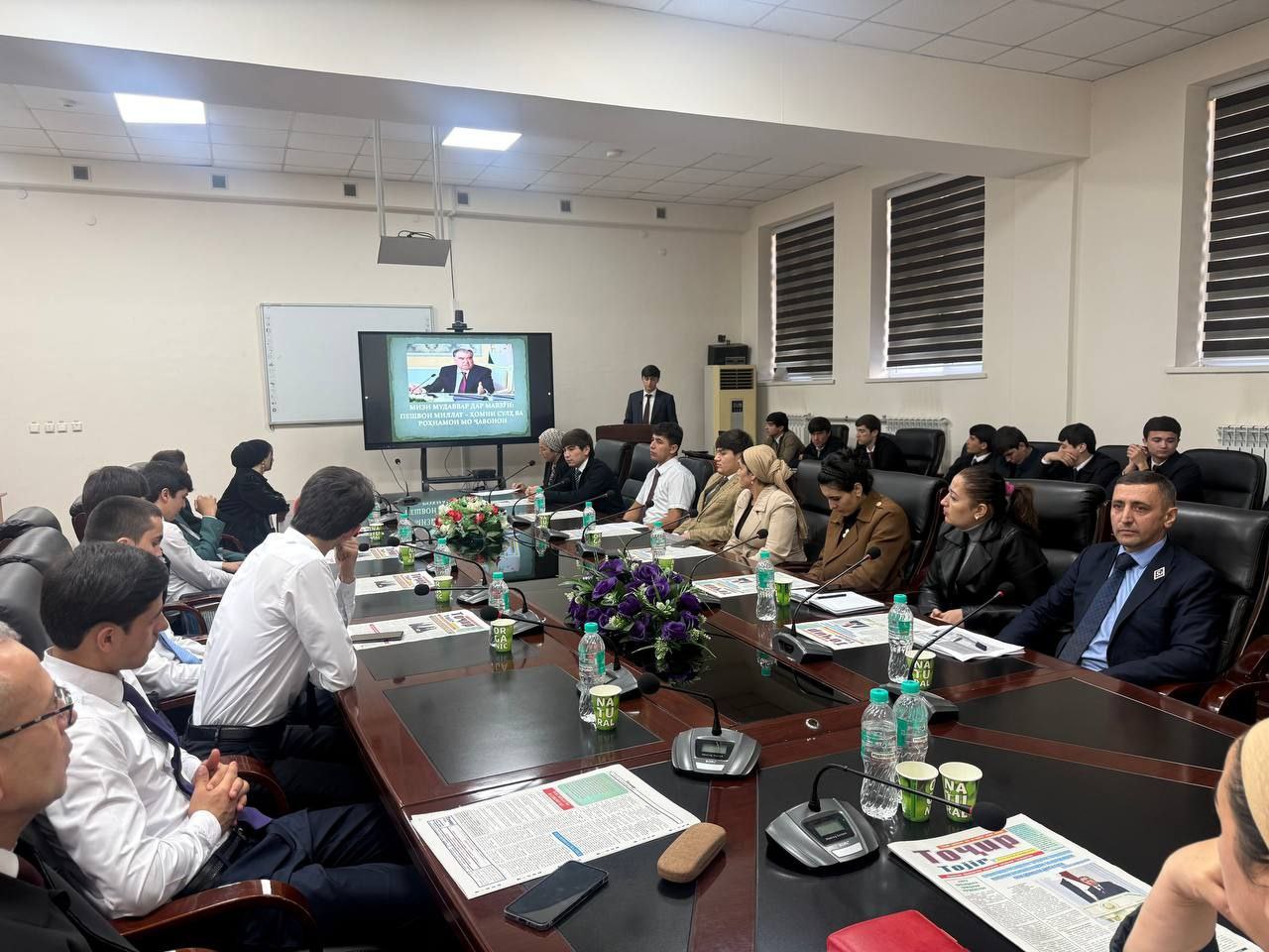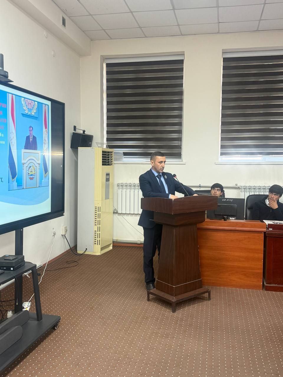 Дар идомаи чорабинӣ омӯзгорони кафедра Раҷабзода Нурҳаёт дар мавзӯи “Нақши Иҷлосияи XVI Шӯрои Олии тақдирсоз дар таърихи навини тоҷикон” ва Парвиз Нидоев дар мавзӯи “Эмомалӣ Раҳмон - Президенти сулҳовар, сулҳпарвар ва ваҳдатофар” суханронӣ намуданд.