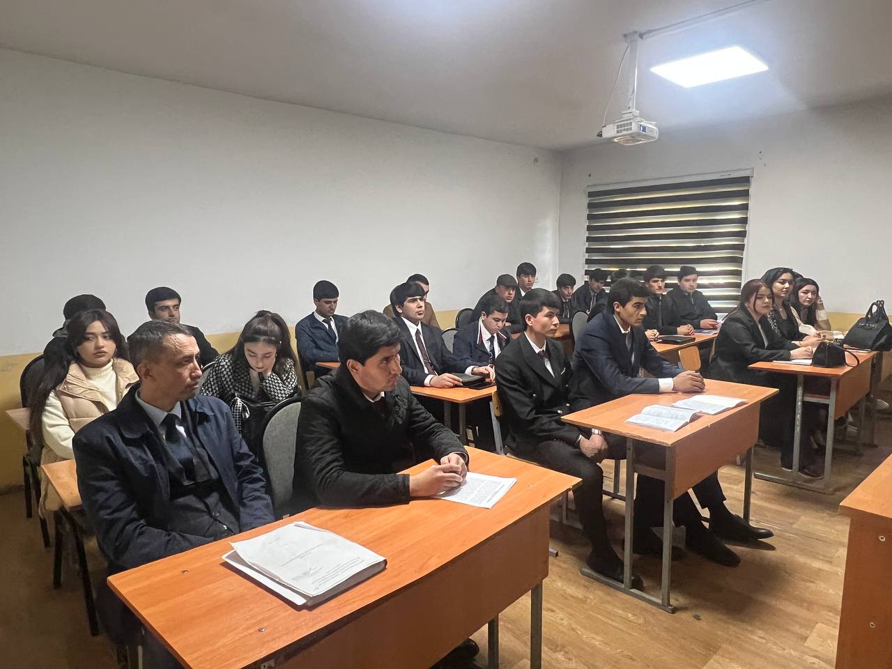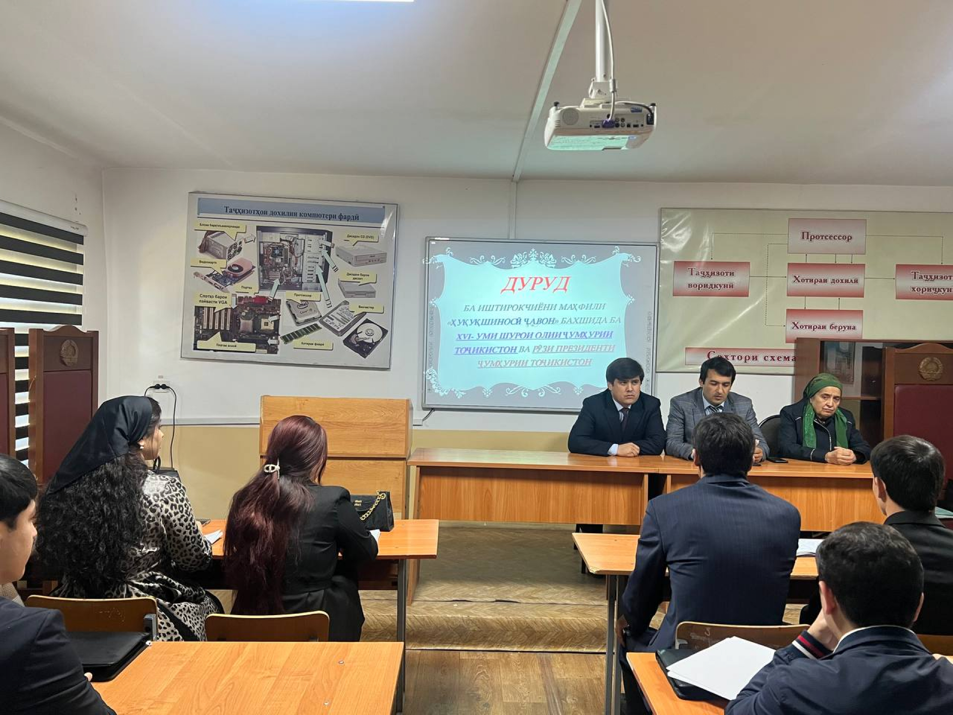 Санаи 13-уми ноябри соли 2025 маҳфили илмӣ-назариявии “Ҳуқуқшиносӣ ҷавон” бахшида ба Рӯзи Президент ва солгарди Иҷлосияи XVI Шурои Олии Ҷумҳурии Тоҷикистон бо иштироки васеи донишҷӯён ва омӯзгорони кафедраи ҳуқуқи тиҷоратӣ ва зиддикоррупсионии факултети муносибатҳои иқтисодии байналмилалӣ, ҳуқуқ ва гумрук баргузор гардид.