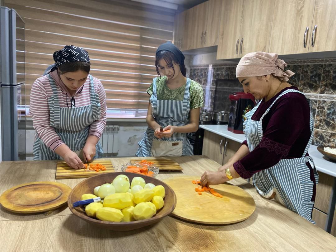 Сипас, духтарон хӯроки омодашударо дар косаҳо бардошта, ба болояш кабудӣ ва чаккаро мувофиқи табъашон ҳамроҳ намуда, бо хушҳолӣ ба бошандагони хобгоҳ - донишҷӯён тақсим намуданд.