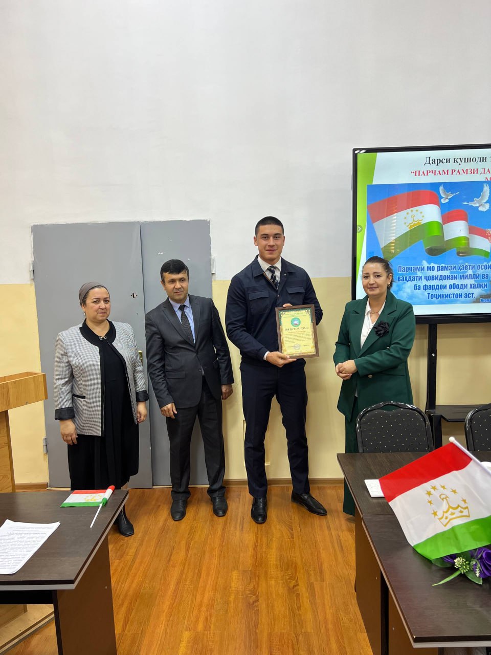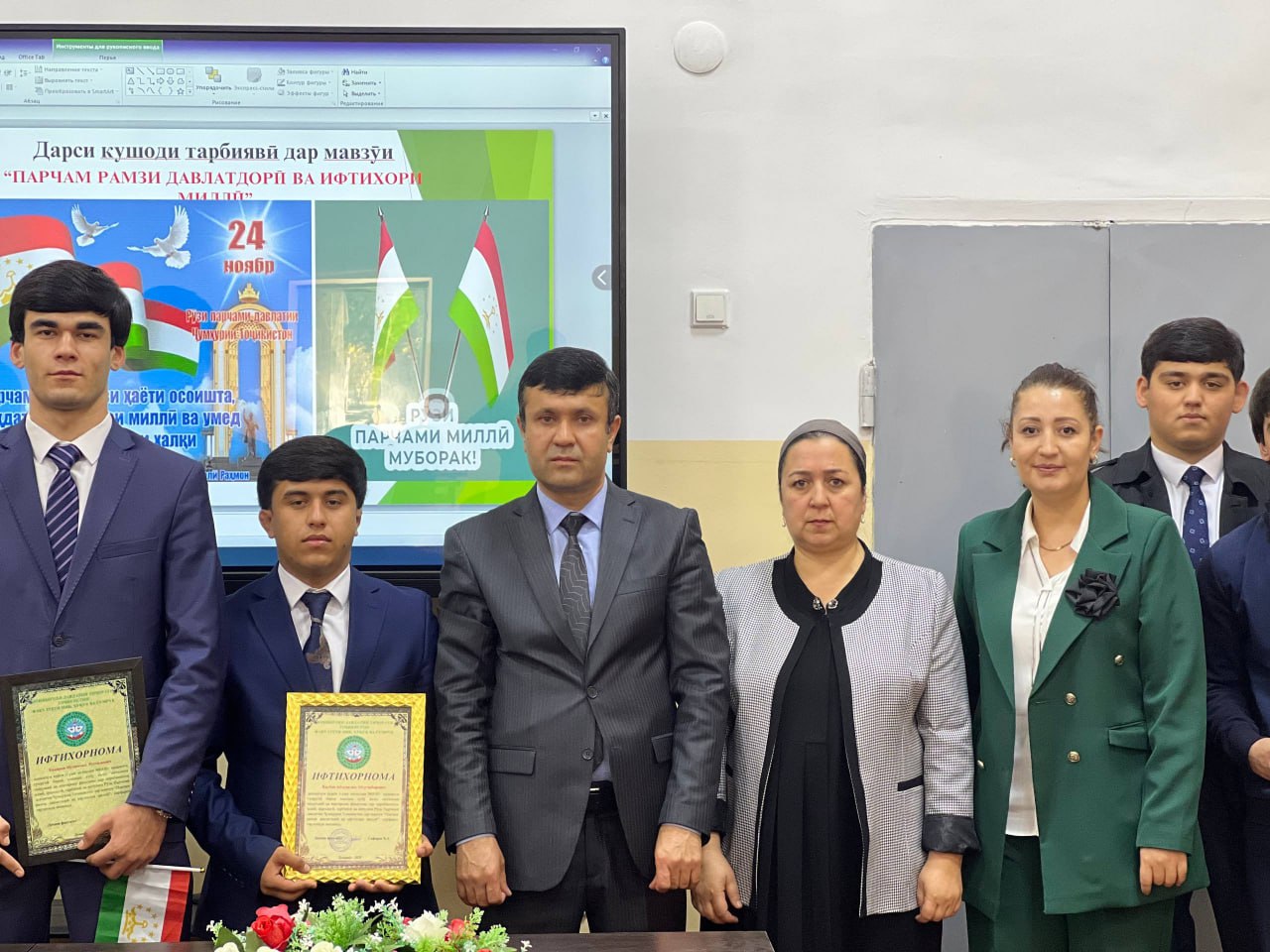 Дарси кушодро омӯзгори кафедра Миҷгона Ашурова оғоз намуда, қайд кард, ки Парчами давлатии Тоҷикистон 24-ноябри соли 1992 дар Иҷлосияи XVI Шурои Олии Ҷумҳурии Тоҷикистон қабул гардида, ҳамчун рамзи давлатдорӣ ва муқаддасоти миллӣ моро ба сӯи созандагию бунёдкорӣ ва саодату хушбахтӣ раҳнамун месозад.