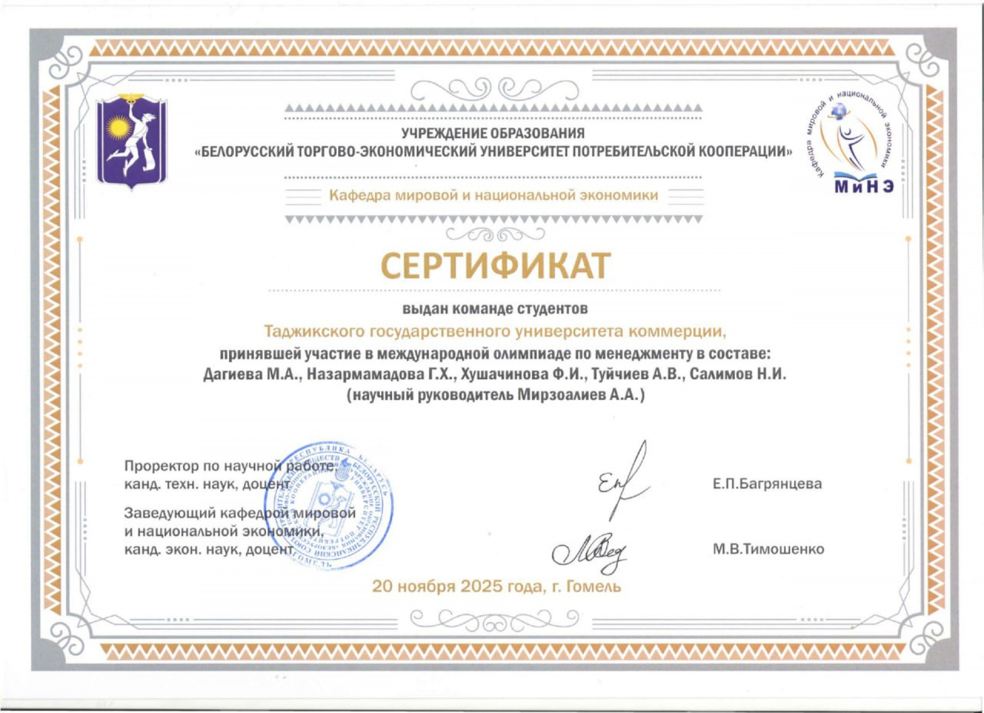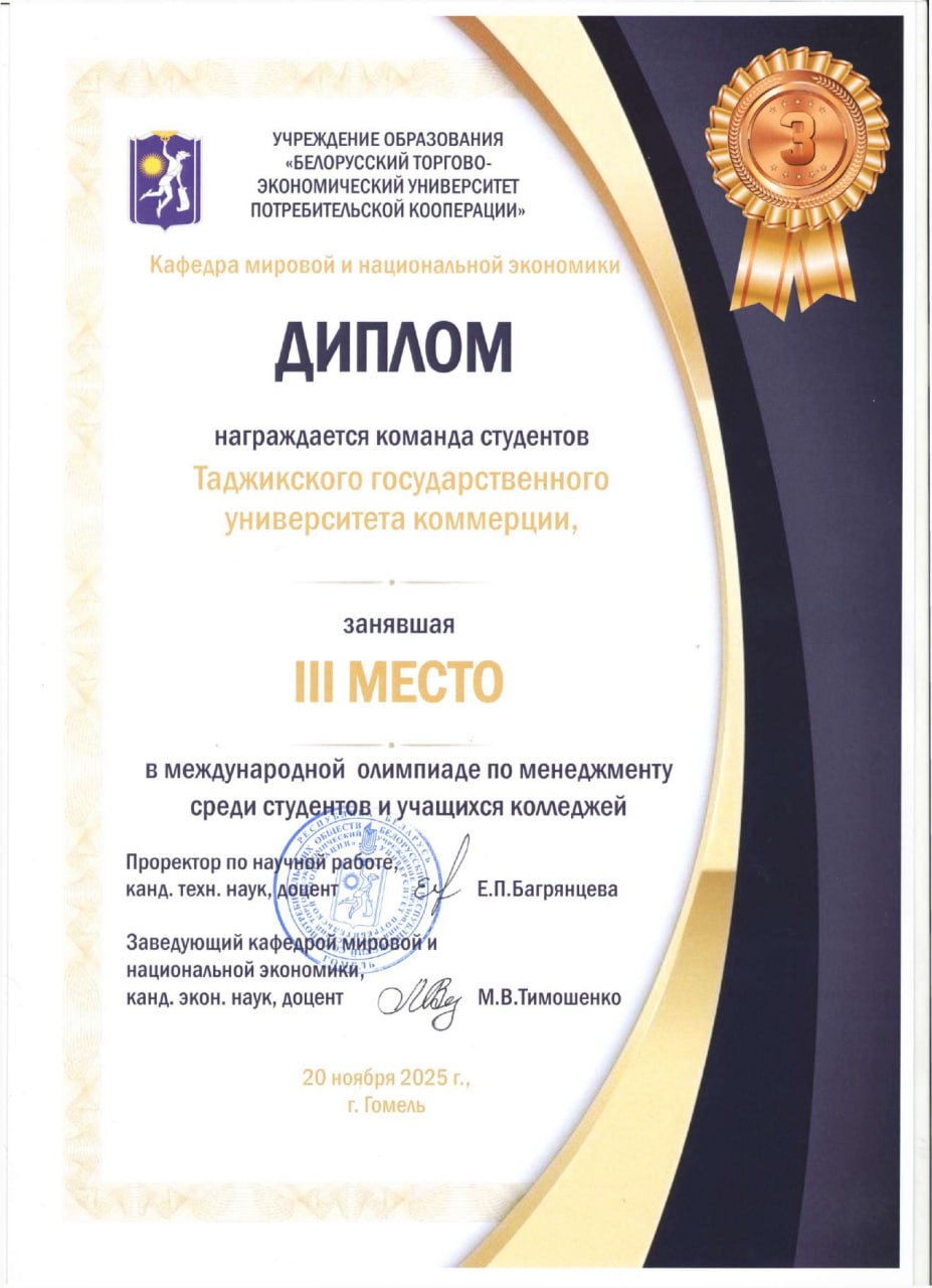20-уми ноябри соли 2025 дар Донишгоҳи тиҷоратию иқтисодии кооператсияи матлуботи Беларус байни донишҷӯёни 18 муассисаи таҳсилоти олӣ ва миёнаи касбии кишварҳои Иттиҳоди Давлатҳои Мустақил олимпиадаи байналмилалӣ аз фанни менеҷмент баргузор гардид
