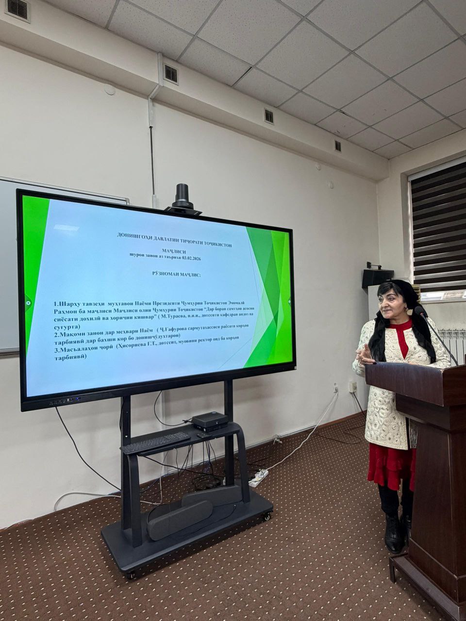 Санаи 3-юми феврали соли 2026 дар Донишгоҳи давлатии тиҷорати Тоҷикистон маҷлиси Шурои занон баргузор гардид, ки шарҳу тавзеҳи муҳтавои Паёми Президенти Ҷумҳурии Тоҷикистон муҳтарам Эмомалӣ Раҳмон ба Маҷлиси Олӣ дар бораи самтҳои асосии сиёсати дохилӣ ва хориҷии кишвар ва мақоми занон дар Паём аз масъалаҳои асосии рӯзномаи маҷлис буданд.