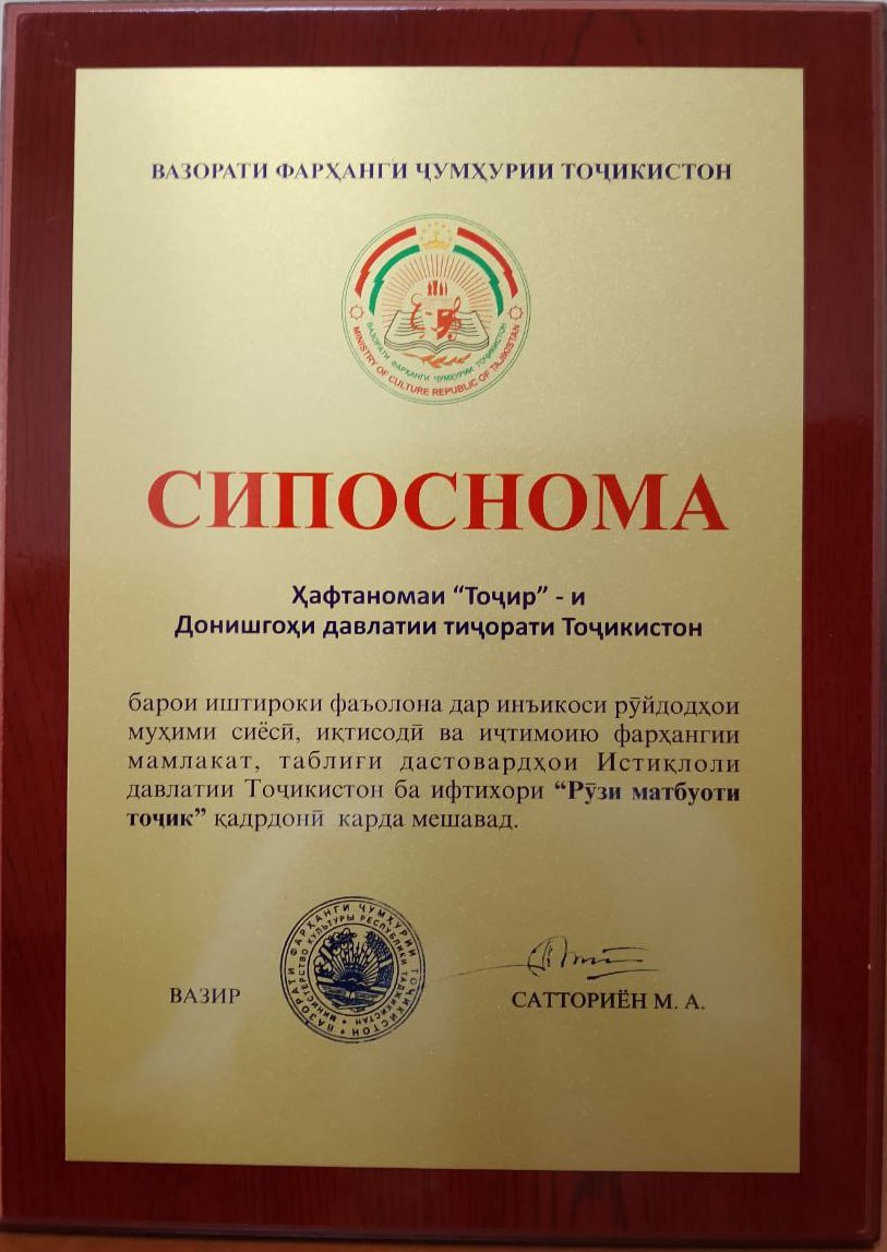 Инчунин, якчанд муассисаҳои нашриявии соҳа, аз ҷумла ҳафтаномаи “Тоҷир”-и Донишгоҳи давлатии тиҷорати Тоҷикистон барои фаъолияти пурсамар, иштироки фаъолона дар инъикоси рӯйдодҳои муҳими сиёсӣ, иқтисодӣ ва иҷтимоию фарҳангии мамлакат, таблиғи дастовардҳои Истиқлоли давлатии Тоҷикистон ва ба ифтихори “Рӯзи матбуоти тоҷик” бо Сипосномаи Вазорати фарҳанги Ҷумҳурии Тоҷикистон қадрдонӣ гардиданд.