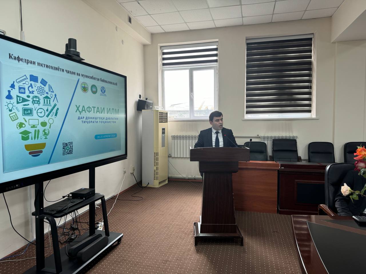 Кори бахши “Иқтисодиёти ҷаҳон”-ро мудири кафедраи иқтисодиёти ҷаҳон ва муносибатҳои байналмилалӣ, дотсент Рустамзода Фитрат Музаффар оғоз намуда, қайд намуд, ки ҳамасола дар ҷумҳурӣ якшанбеи ҳафтаи сеюми моҳи апрел ҳамчун Рӯзи илми тоҷик таҷлил карда мешавад. Кафедра бо мақсади дар сатҳи баланд ҷашн гирифтани Рӯзи илми тоҷик гузаронидани конференсияи илмию назариявии омӯзгорон, озмуну маҳфилҳо, дарсҳои кушод ва дигар чорабиниҳои илмиро ба нақша гирифтааст.